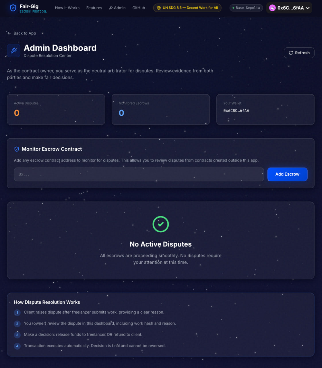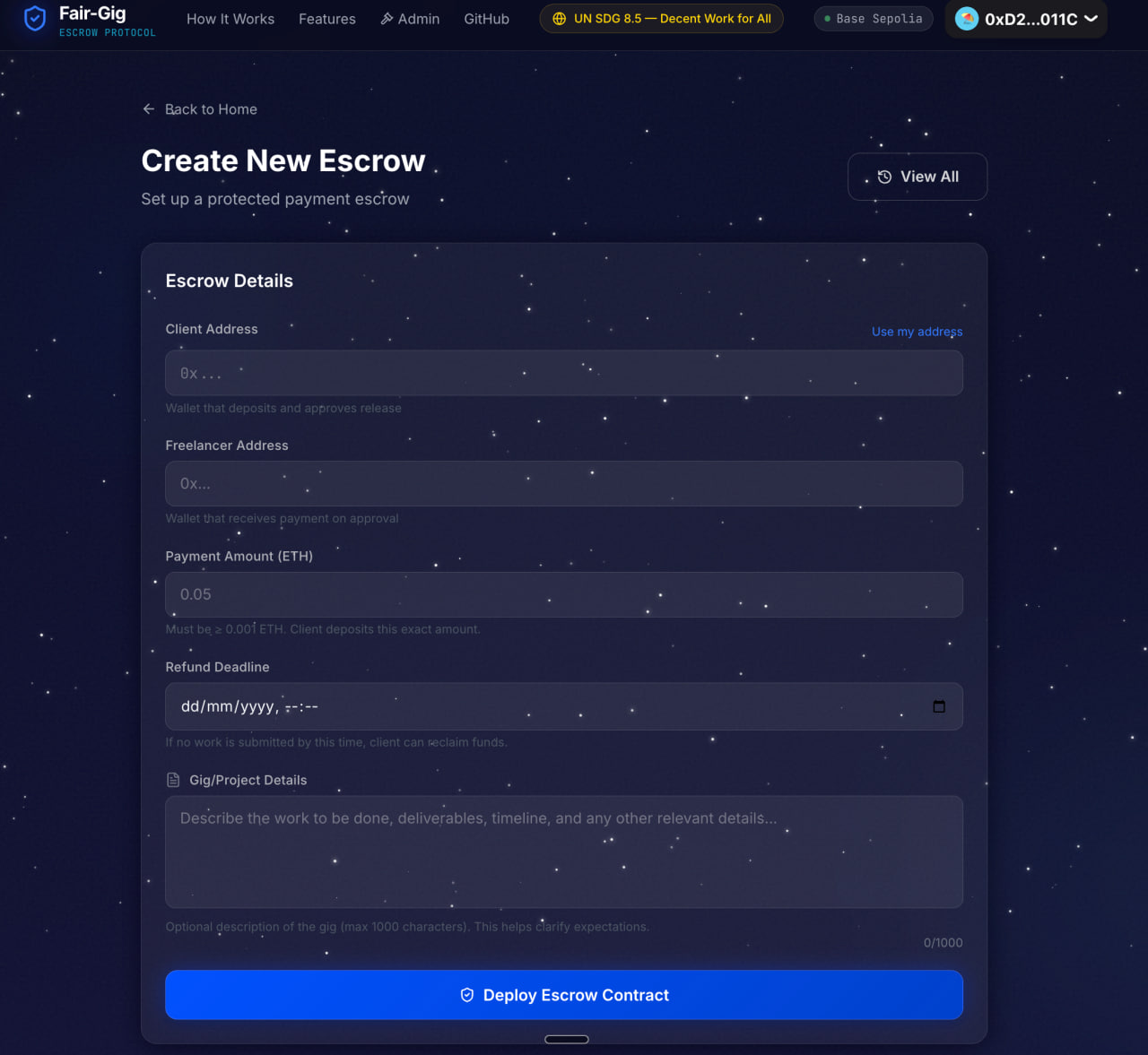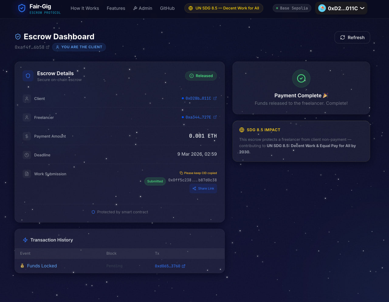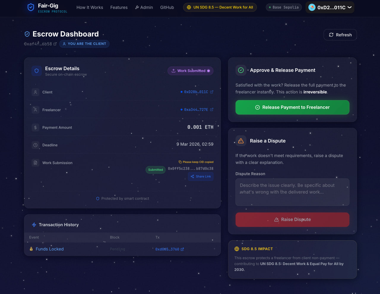 Client creates an escrow and deposits ETH directly into a smart contract Freelancer sees the funds are locked — on-chain, verifiable, immovable without her Freelancer submits her work with an IPFS content hash as cryptographic proof of delivery Client approves — funds release instantly to her wallet, no middleman, no delay Dispute arises — a neutral arbitrator resolves it fairly, with the evidence on-chain Client goes silent past deadline — refund becomes available, but only then