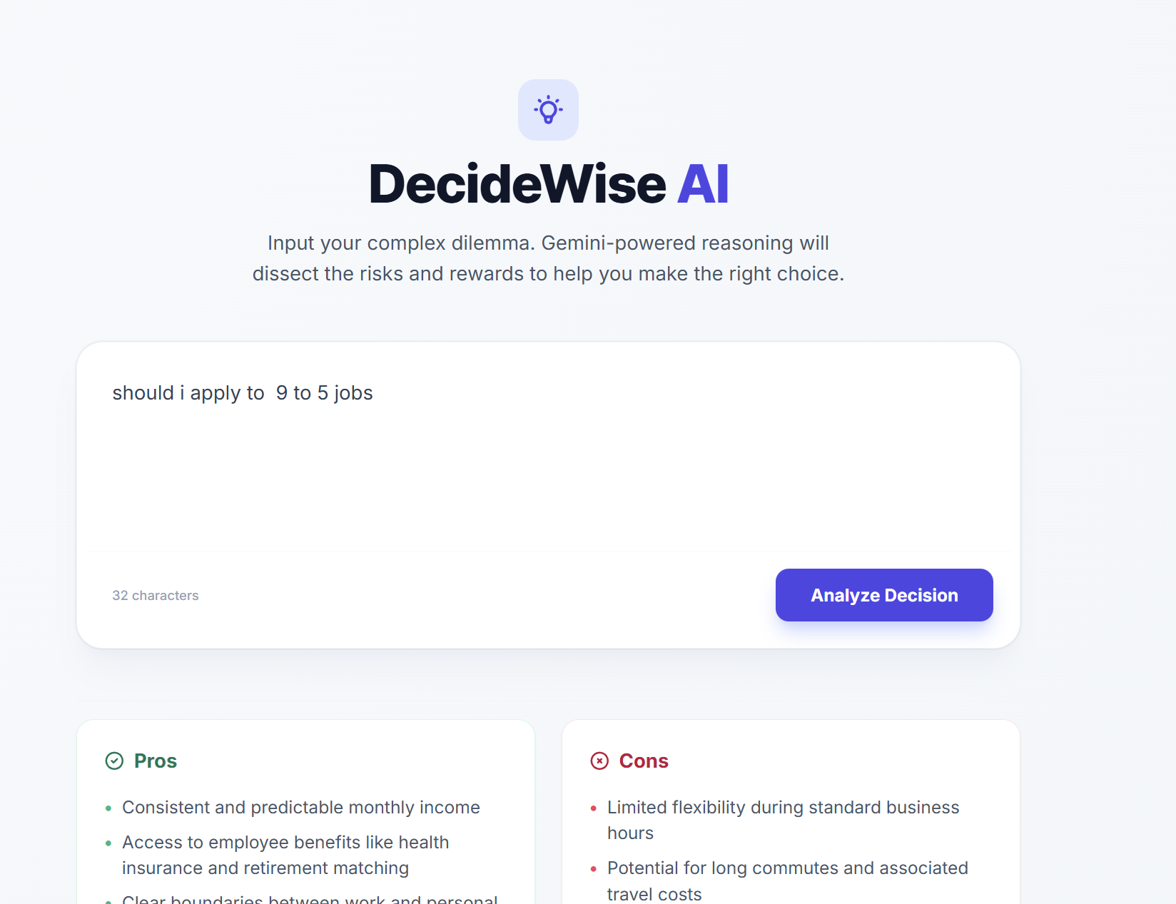 The idea for Daily Decision Helper came from observing how much time people spend overthinking everyday decisions—choosing between job offers, planning study schedules, or even deciding whether to take a risk or play it safe. Many of these choices are not about lacking information, but about struggling to organize thoughts logically. I wanted to build a tool that acts like a rational second brain, helping users structure their thinking instead of replacing it.