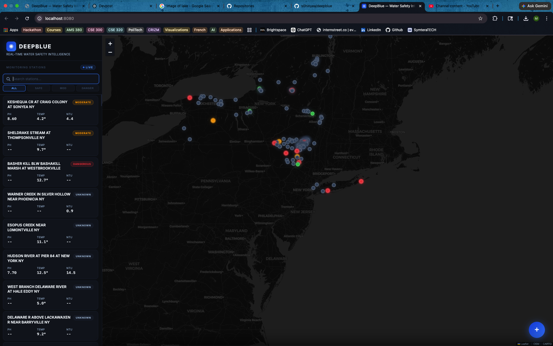 It continuously ingests live sensor data (pH, temperature, turbidity) from 180+ monitoring stations across New York. When community members spot something concerning, such as discoloration, debris, or algae, they can upload a photo directly to the app.