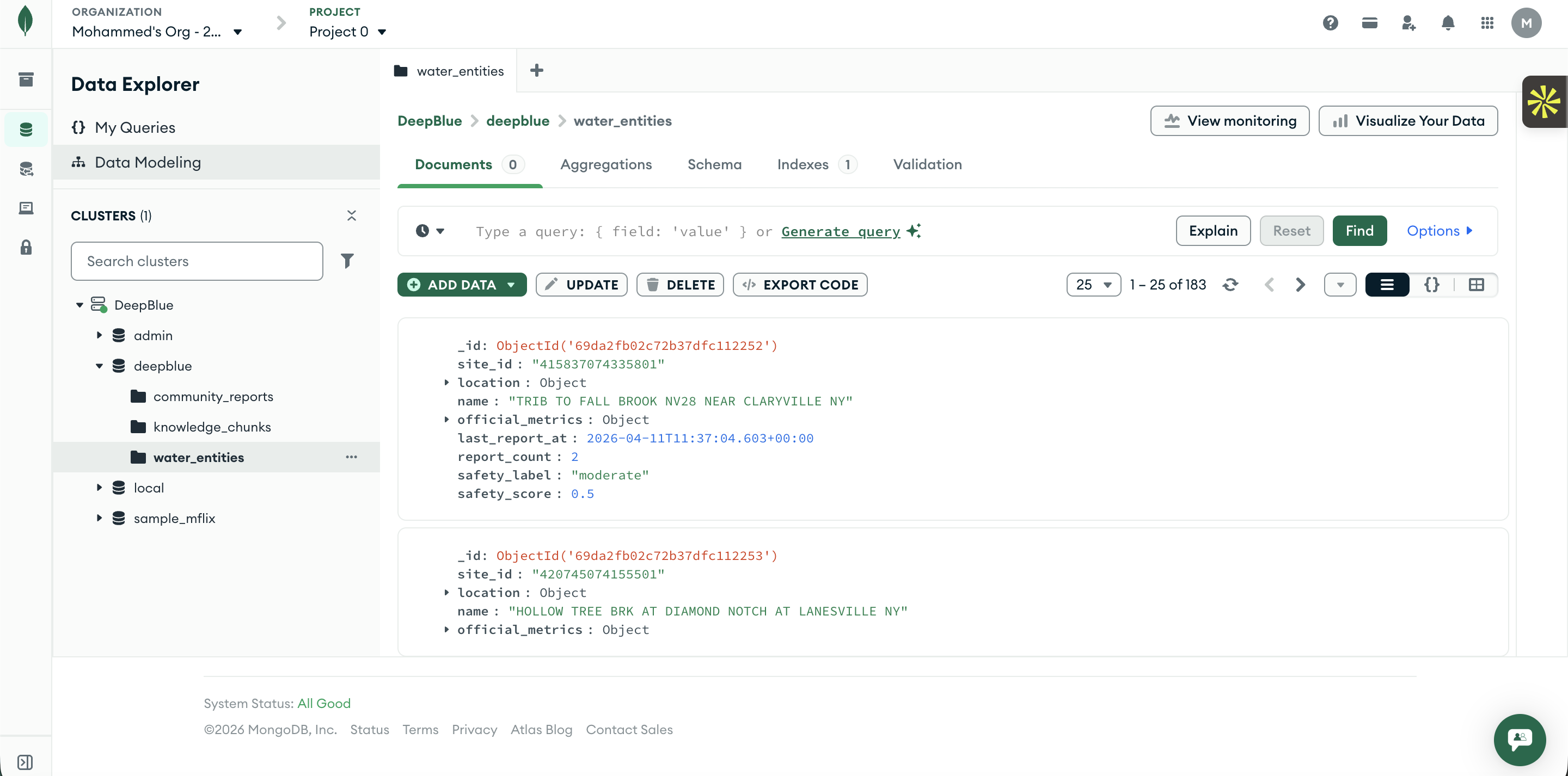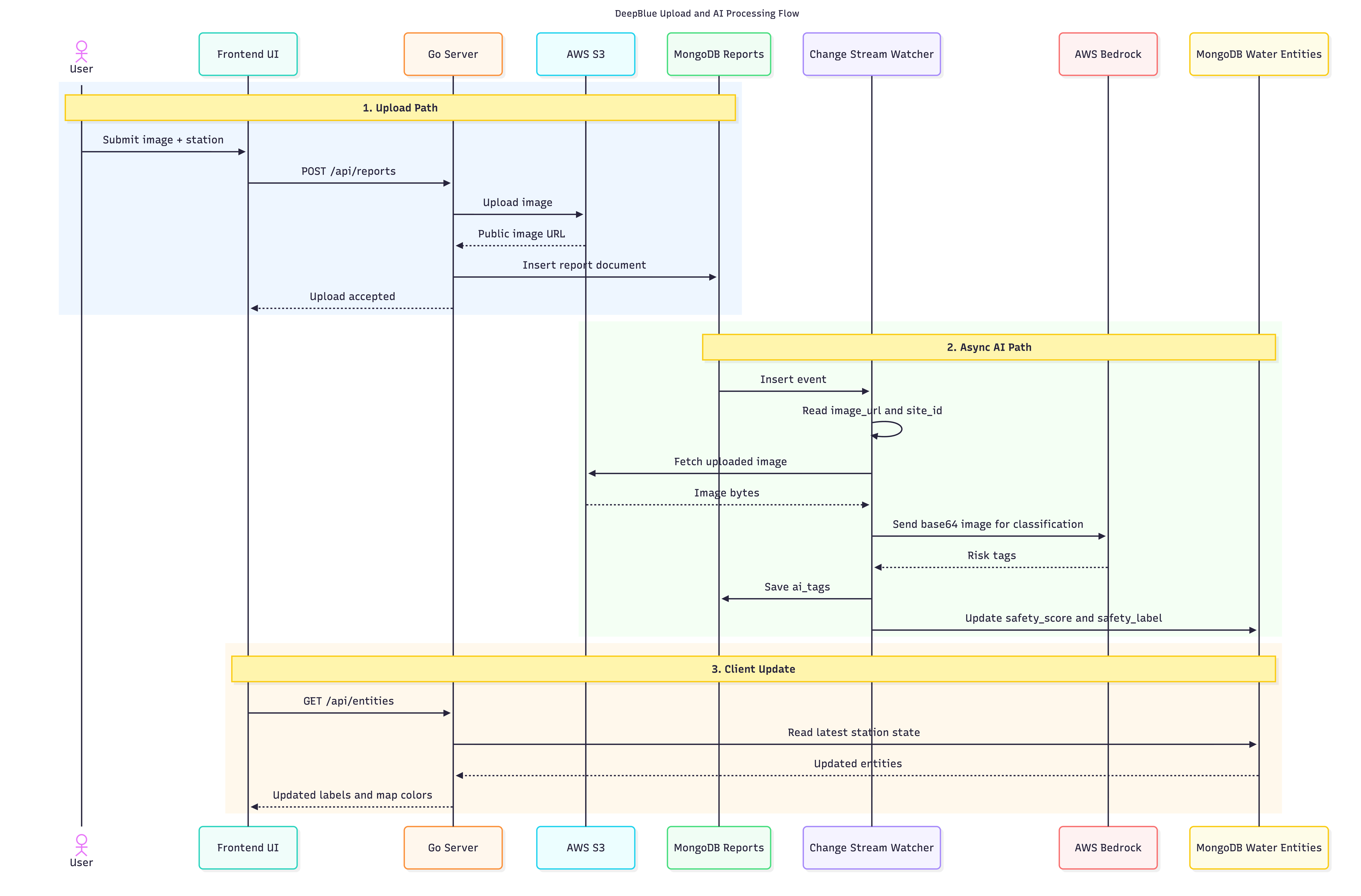 Multimodal AI Pipeline : The Change Stream triggers an asynchronous call to Claude 3.5 Sonnet via AWS Bedrock. Claude analyzes the image, extracts hazard tags (e.g., "algae", "turbid"), and computes a visual risk score that is immediately written back to the station's document in Atlas, automatically re-rendering its safety label on the live map.