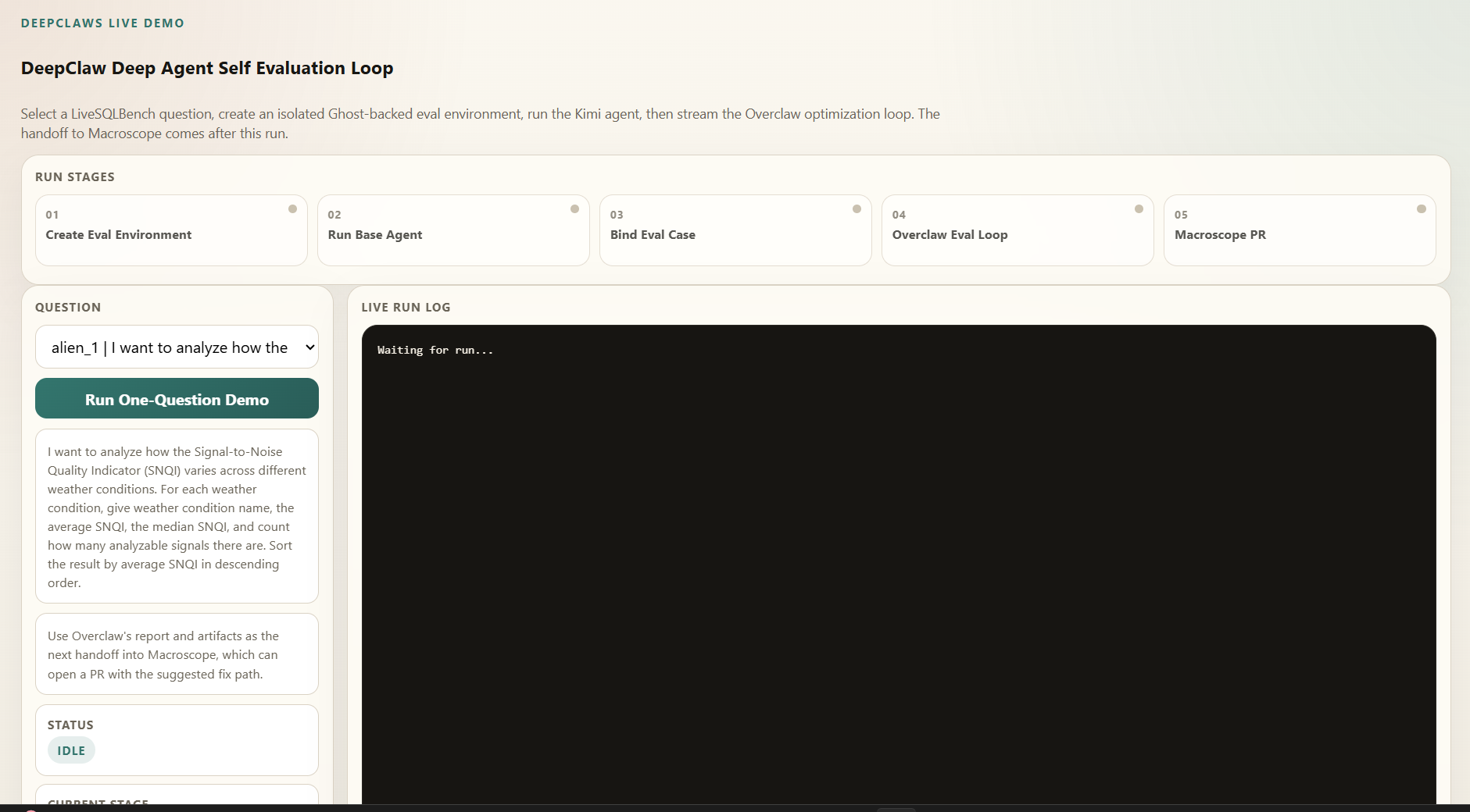 DeepClaws is a hackathon prototype for a self-improving SQL agent loop on LiveSQLBench.