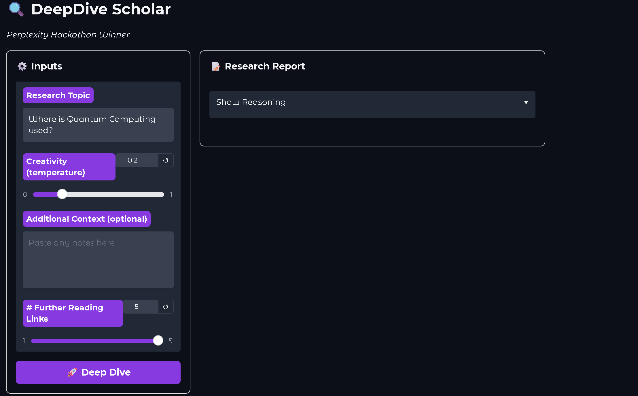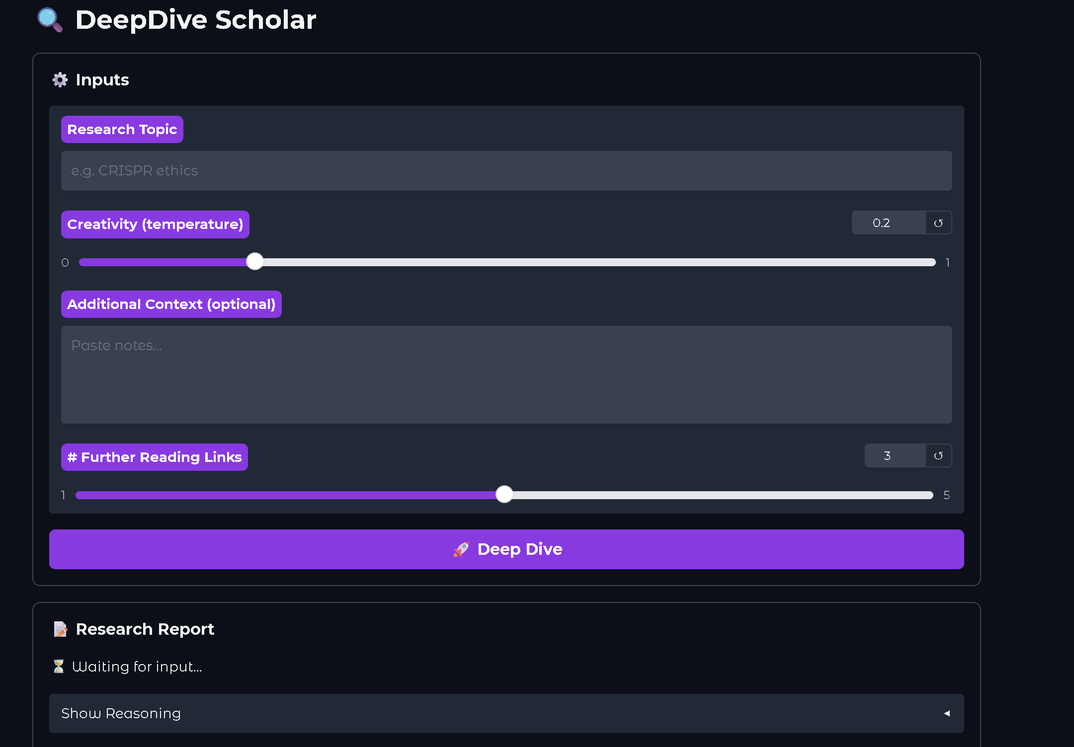 I often found myself spending hours sifting through academic papers and web articles to gather concise, reliable information—only to lose track of my sources. I wanted a tool that could not only answer complex research questions but also show its reasoning, cite every fact, and suggest further reading. That spark led me to build DeepDive Scholar, an AI-powered research companion that brings transparency and efficiency to the research process.