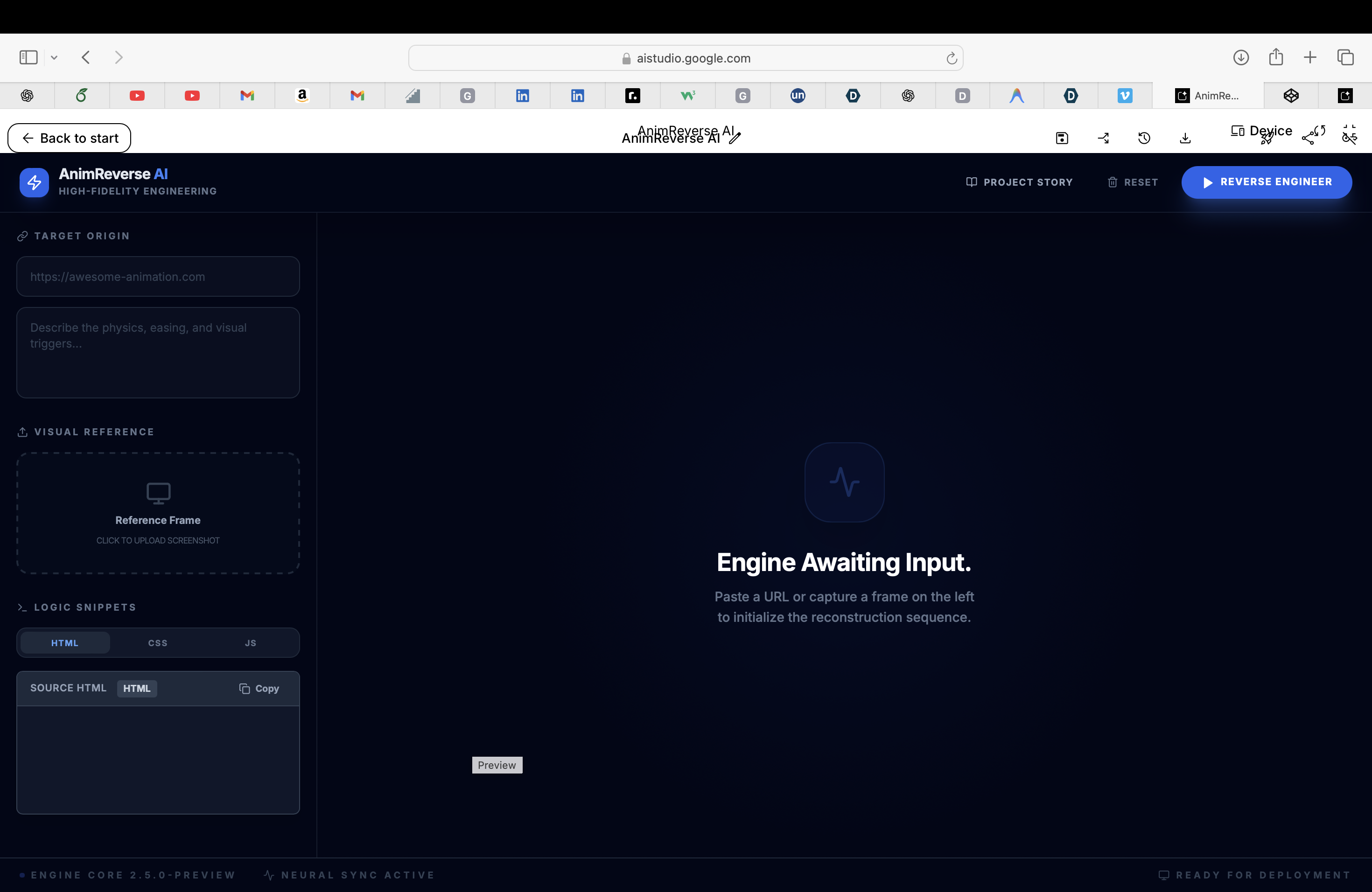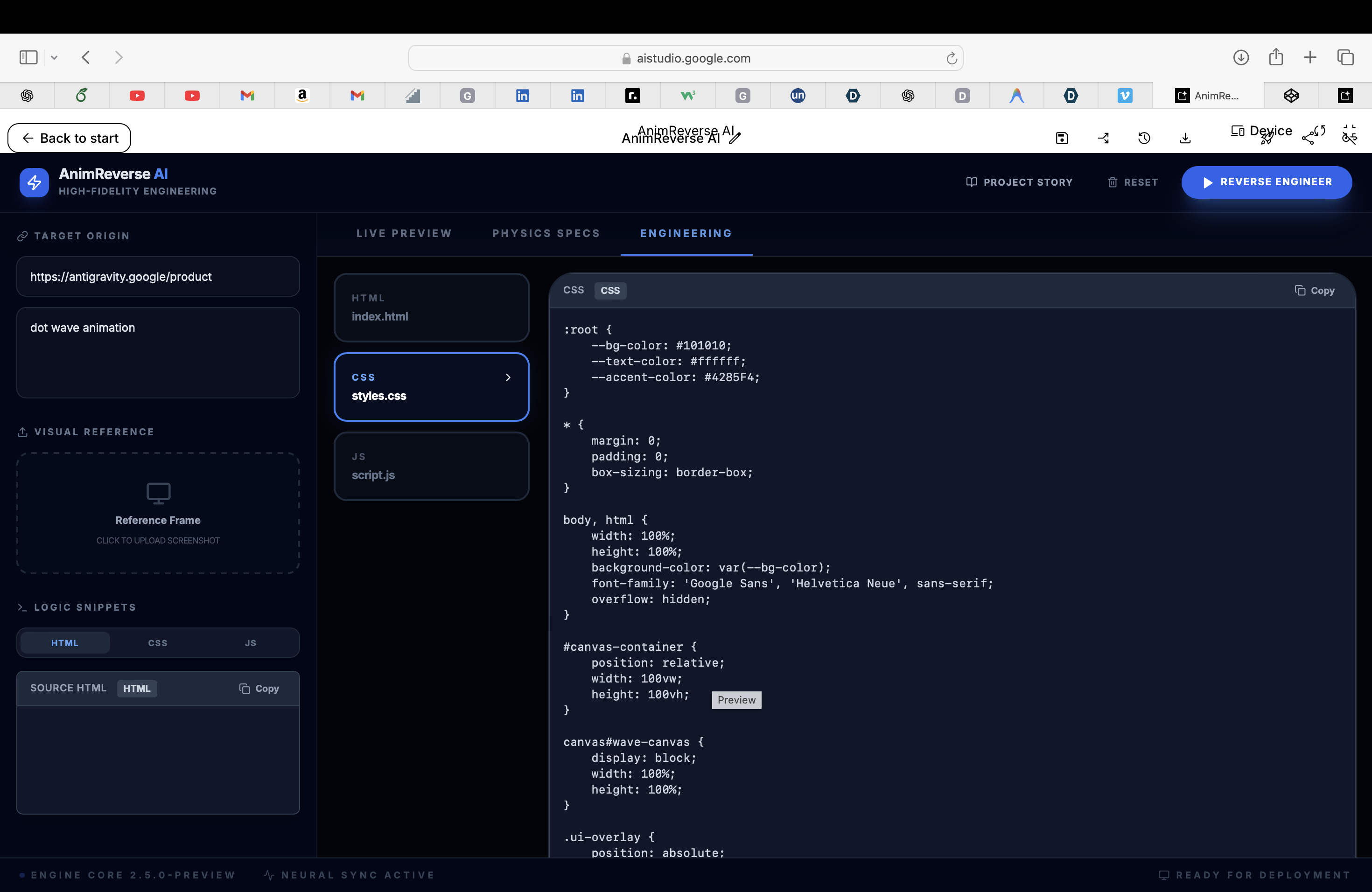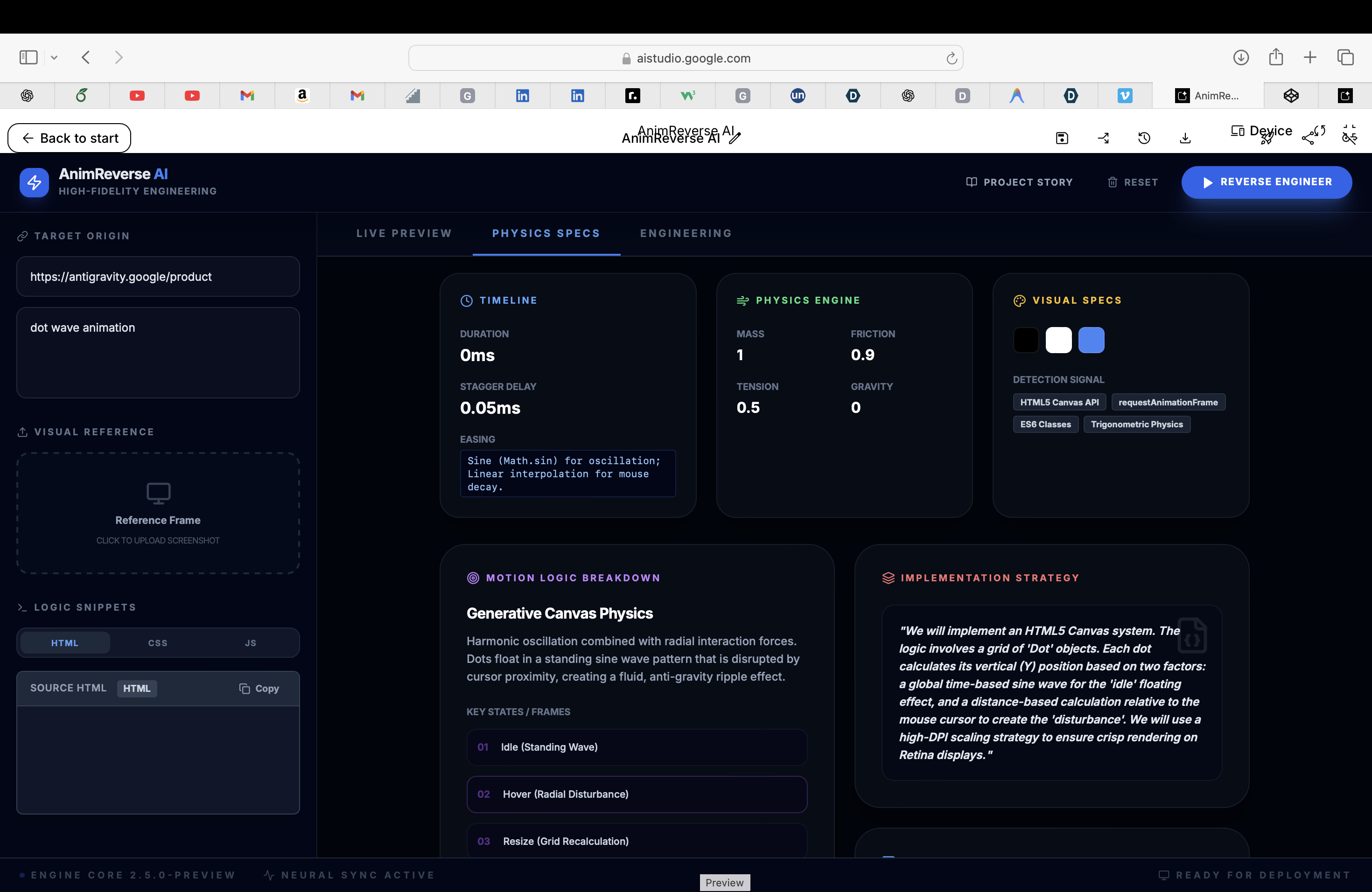 Inspiration Every frontend developer has experienced this moment: you scroll through a website, notice a beautiful animation, and immediately wonder how it was built. Sometimes it’s a subtle hover effect, sometimes it’s a flowing background or a smooth page transition. Recreating that motion usually means digging through DevTools, experimenting with easing curves, and guessing timing values — a process that can take hours. I wanted to remove that friction. AnimReverse AI started as a simple idea: what if a tool could observe an animation and translate what it sees into usable source code? Instead of manually reverse-engineering interactions, developers could focus on creativity and iteration. The goal was not to copy anyone’s work, but to learn from visual behavior and recreate it in an original way. How I Built It The application is built using Google’s Gemini 3 multimodal model through AI Studio. Users can either provide a website URL or upload a screenshot of an animation. When a live page cannot be accessed due to browser security restrictions, the image path ensures the system still works reliably. Once the input is provided, the model analyzes motion patterns, layout structure, color distribution, and timing behavior. Instead of treating the animation as static pixels, the system reasons about how elements move over time and what type of mechanism could produce that effect. Based on this understanding, the application generates a clean, standalone implementation using HTML, CSS, and JavaScript. To make the experience practical, the generated code is rendered immediately inside a live preview panel, allowing users to see the animation running, tweak values, and export the files. Challenges One of the main challenges was dealing with website embedding restrictions. Many modern sites block iframe loading, which prevents direct inspection of the page. I solved this by adding a visual fallback workflow where users upload a screenshot instead. The AI then reconstructs the animation purely from visual reasoning. Another challenge was maintaining consistency across generated files. Since the system produces HTML, CSS, and JavaScript separately, mismatched class names or IDs can easily break the animation. This was addressed by enforcing a strict structured output format so identifiers remain synchronized automatically. What I Learned This project reinforced how sensitive animation is to timing and motion. Very small changes in delay or easing can drastically change how polished an interaction feels. I also learned that modern AI models are surprisingly good at identifying visual patterns that humans intuitively recognize but struggle to quantify. More importantly, building AnimReverse AI showed me that AI can be a creative partner rather than just a code generator. Instead of replacing developers, it accelerates experimentation and helps translate visual ideas into working systems faster.