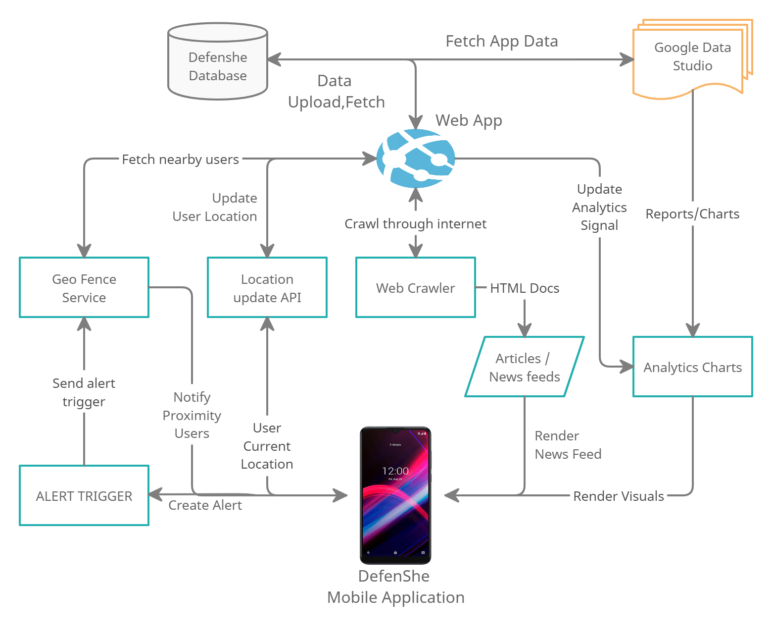 DefenShe posed us a great challenge in implementing the dynamic User positioning (GeoFence) to power the application. It requires real-time transmitting of GPS data, processing data at the cloud, triggering an alert, and rendering it back to the UI at the same time. All these should be done within a fraction of seconds so as to comply with the security threat.