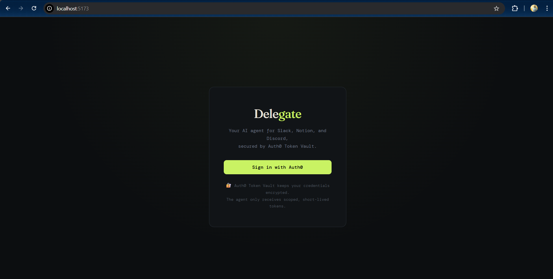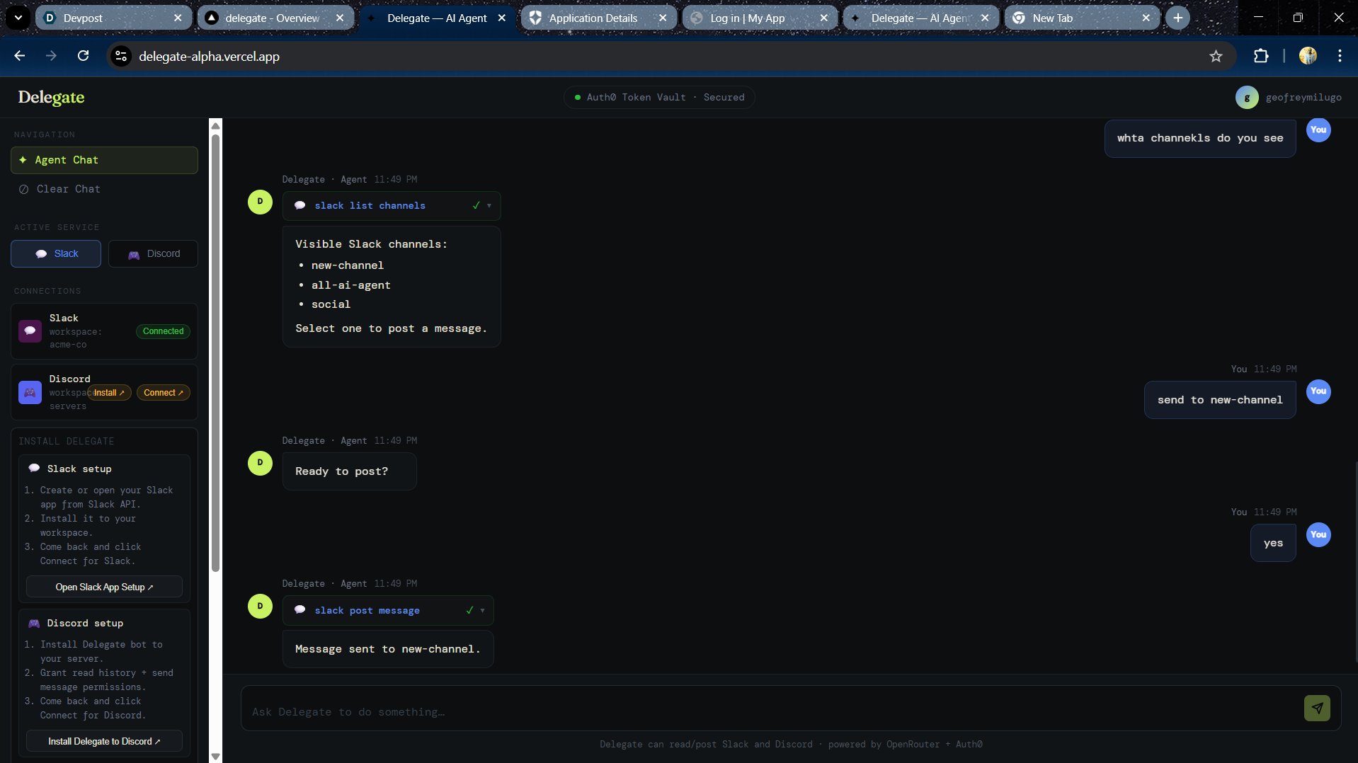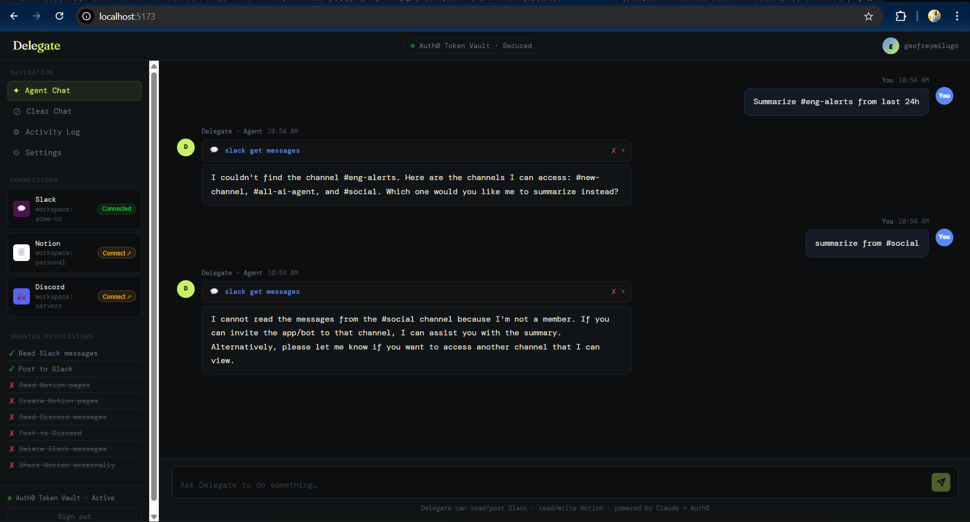 Delegate is an Auth0-secured AI agent for Slack and Discord. Users sign in, connect services through Auth0 Token Vault, and chat with the agent to read recent messages summarize conversations identify blockers/action items draft and post updates to channels The app streams responses in real time and shows tool execution events so users can see what the agent is doing.