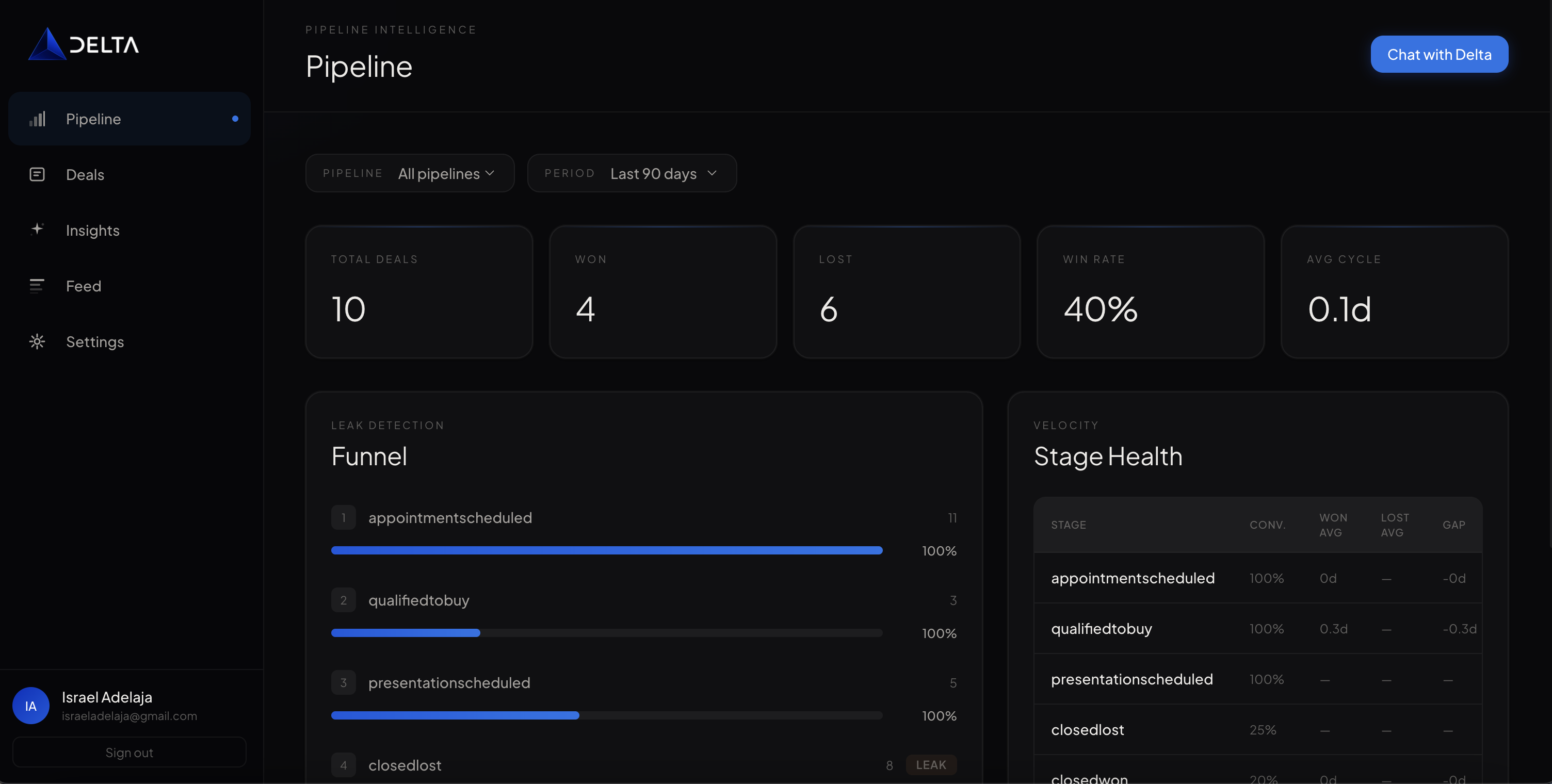Delta is an AI sales execution coach. It connects CRM, email, meetings, and notes into one live deal view, learns from won and lost deals to spot patterns and risks, flags what's slipping, recommends next steps, scores execution, and closes the loop by drafting responses and updating the CRM automatically.