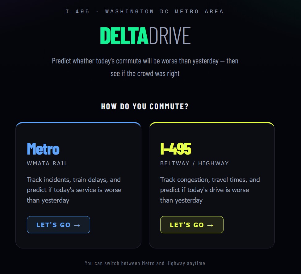 DeltaDrive is a real-time I-495 corridor intelligence app covering Springfield → Bethesda. It pulls live WMATA incident and train delay data alongside TomTom highway travel times, blends them into a composite 0–100 corridor score, and lets users explore the data through interactive brushable time-series charts. Every 5 minutes it snapshots conditions so you can compare today against the same clock time yesterday.
