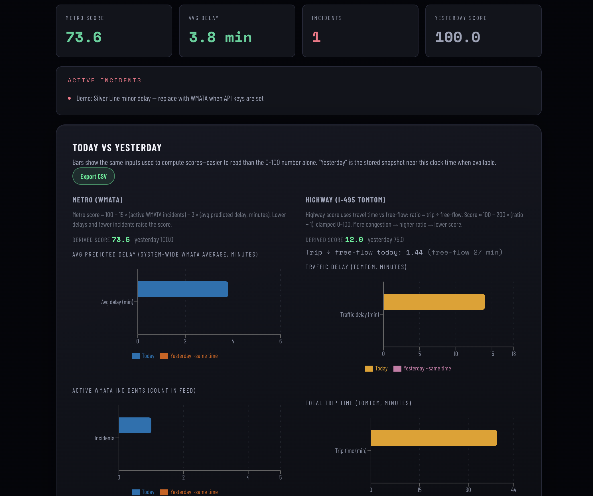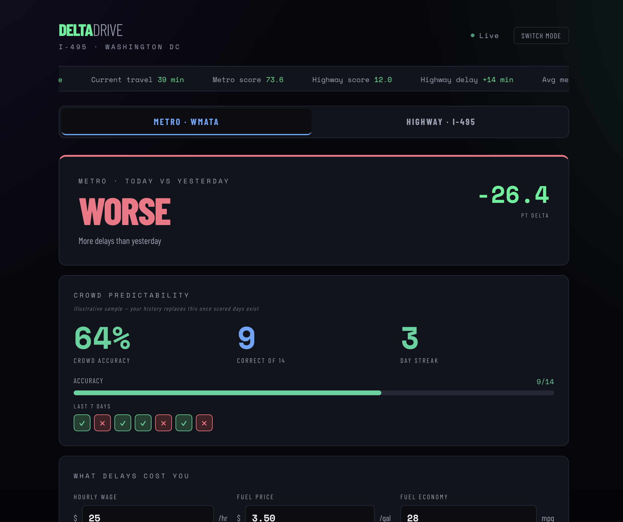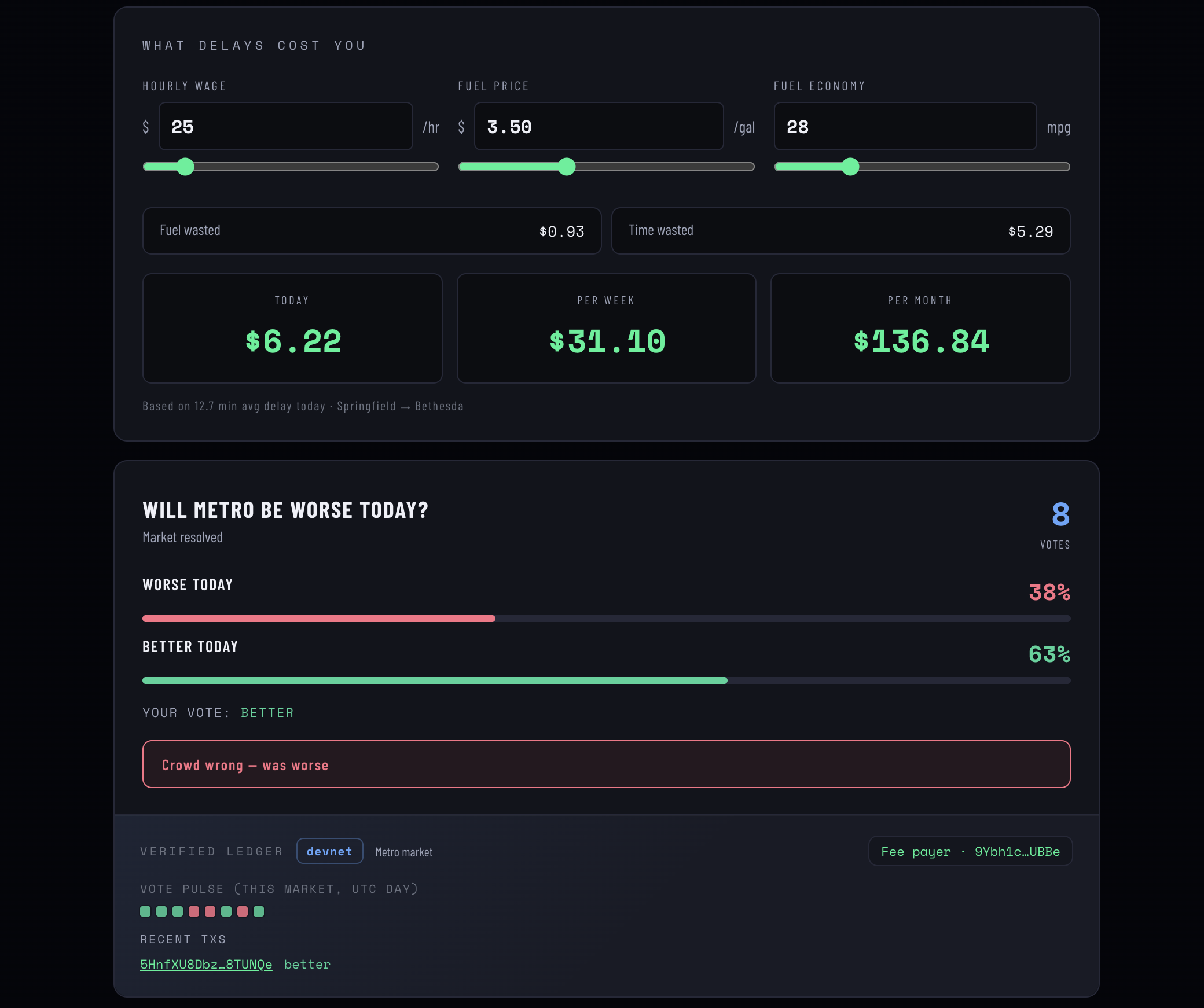 DC commuters face the same frustrating question every morning: is today going to be worse than yesterday? The I-495 Beltway and WMATA rail are two of the most congested corridors in the country, yet there's no single place to see both signals together, compare today against a historical baseline, and let a crowd make a verifiable prediction. We wanted to build that — not just a dashboard, but a live operational picture with skin in the game.