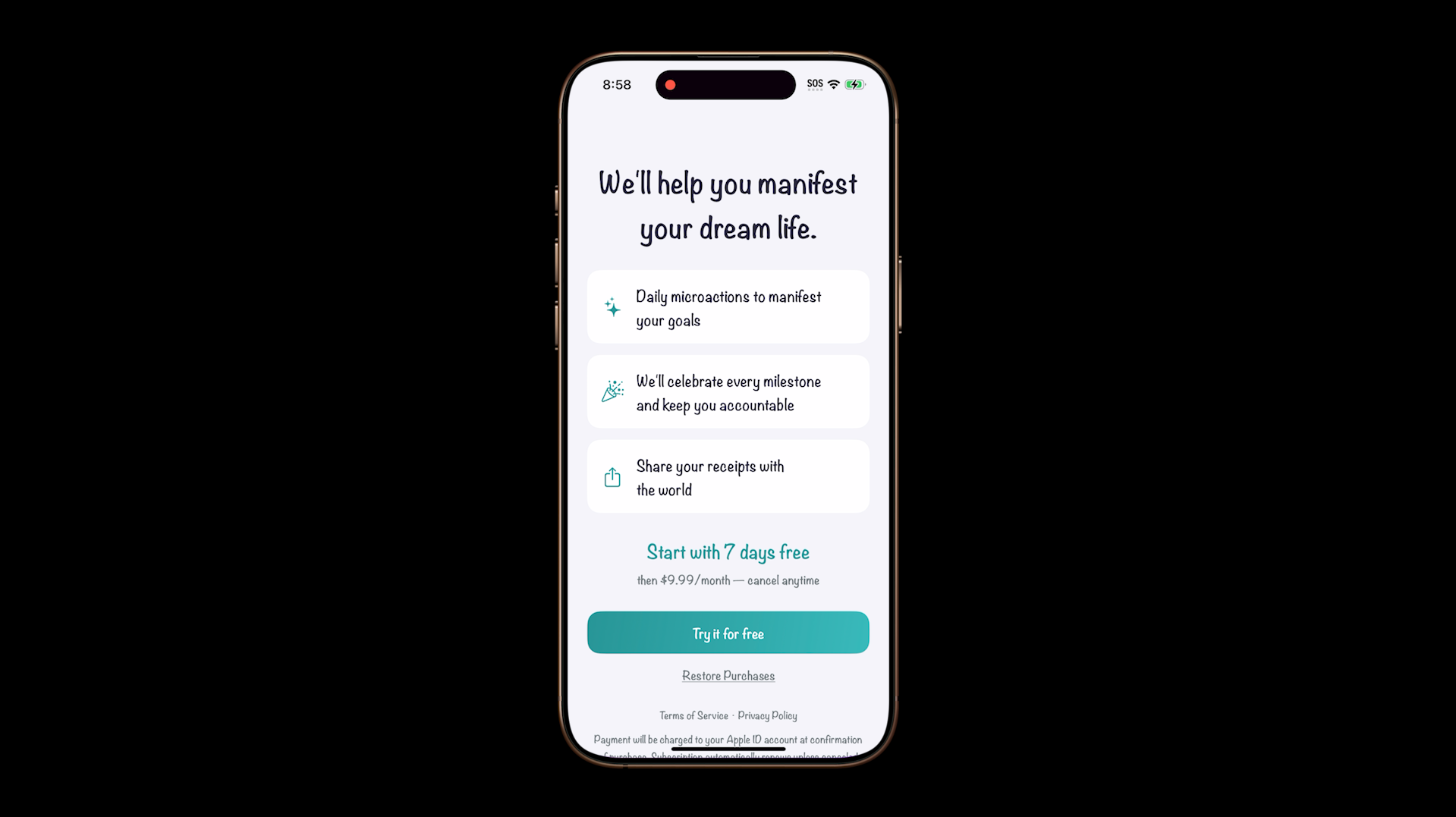 The paywall is presented after the user has built their first vision board during onboarding — by that point, they've invested emotionally. RevenueCat's data shows hard paywalls at this stage drive significantly higher conversion.