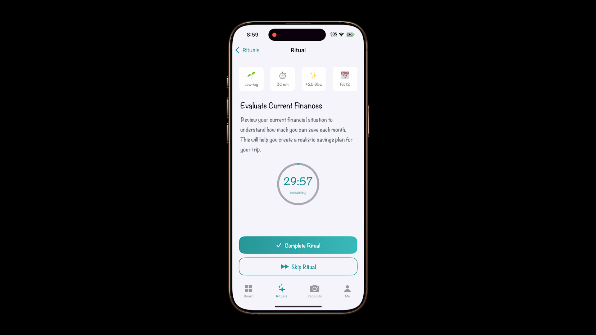 - ⏱️ Act On It — When she starts a Ritual, a timer locks in — no half-commitments. When she finishes: confetti, warm encouragement, a hit of dopamine.