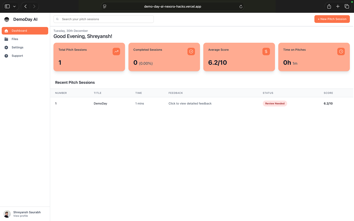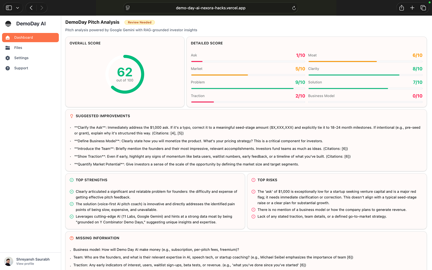 Unlike expensive coaches, biased friends or slow feedback loops, DemoDay AI is built for rapid iteration: pitch → pressure test → feedback → rewrite → repeat. It evaluates whether an investor can repeat your company in one sentence, whether the narrative flows, what would block a partner from leaning in and exactly what to fix before the next meeting.