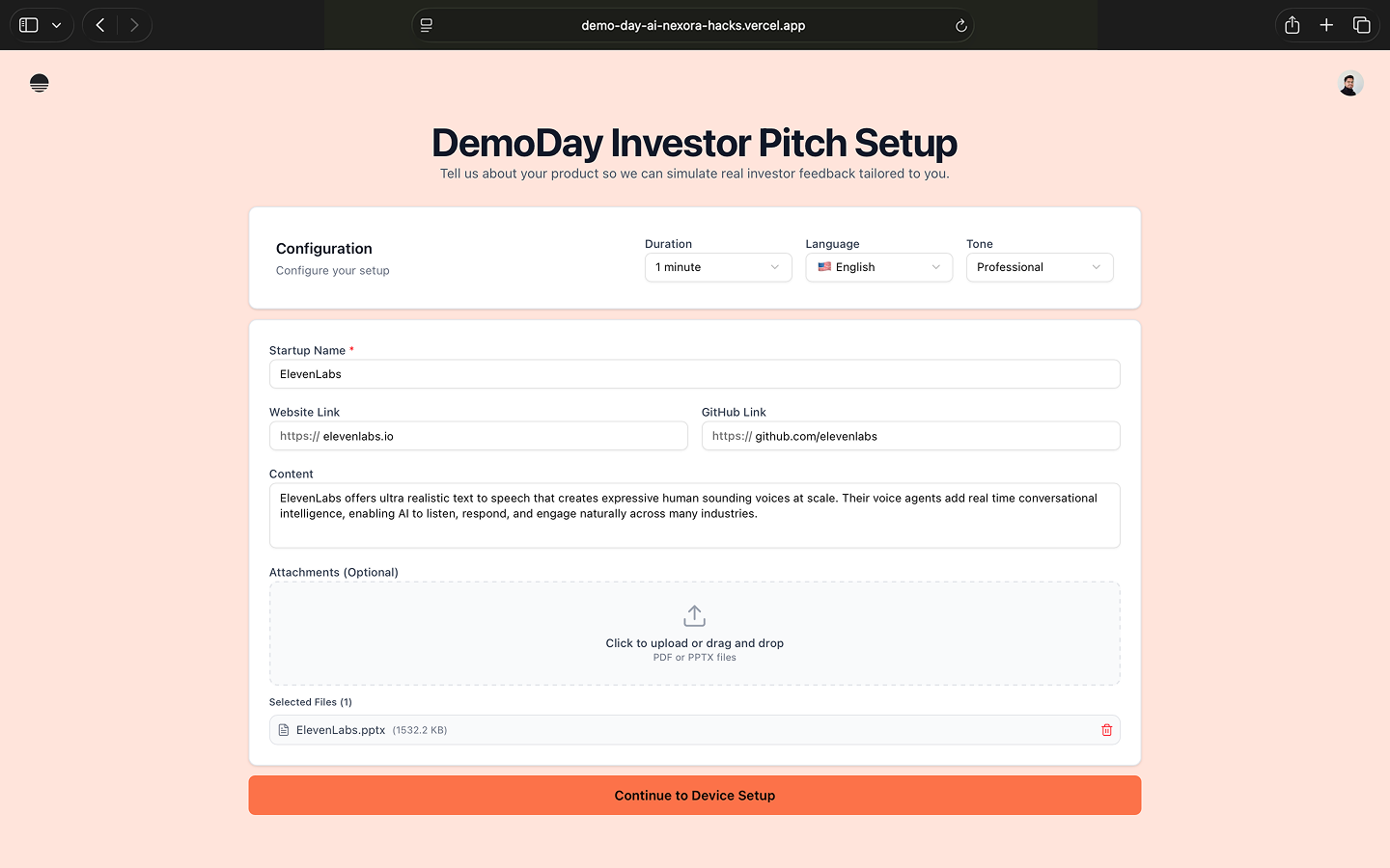 DemoDay AI is a voice-first AI pitch coach platform for founders that simulates a real investor meeting end to end. Founders deliver their pitch out loud, face realistic VC-style follow-up questions and receive actionable, structured feedback on clarity, structure, fundability and concrete next steps—so they can iterate fast before real investor conversations.