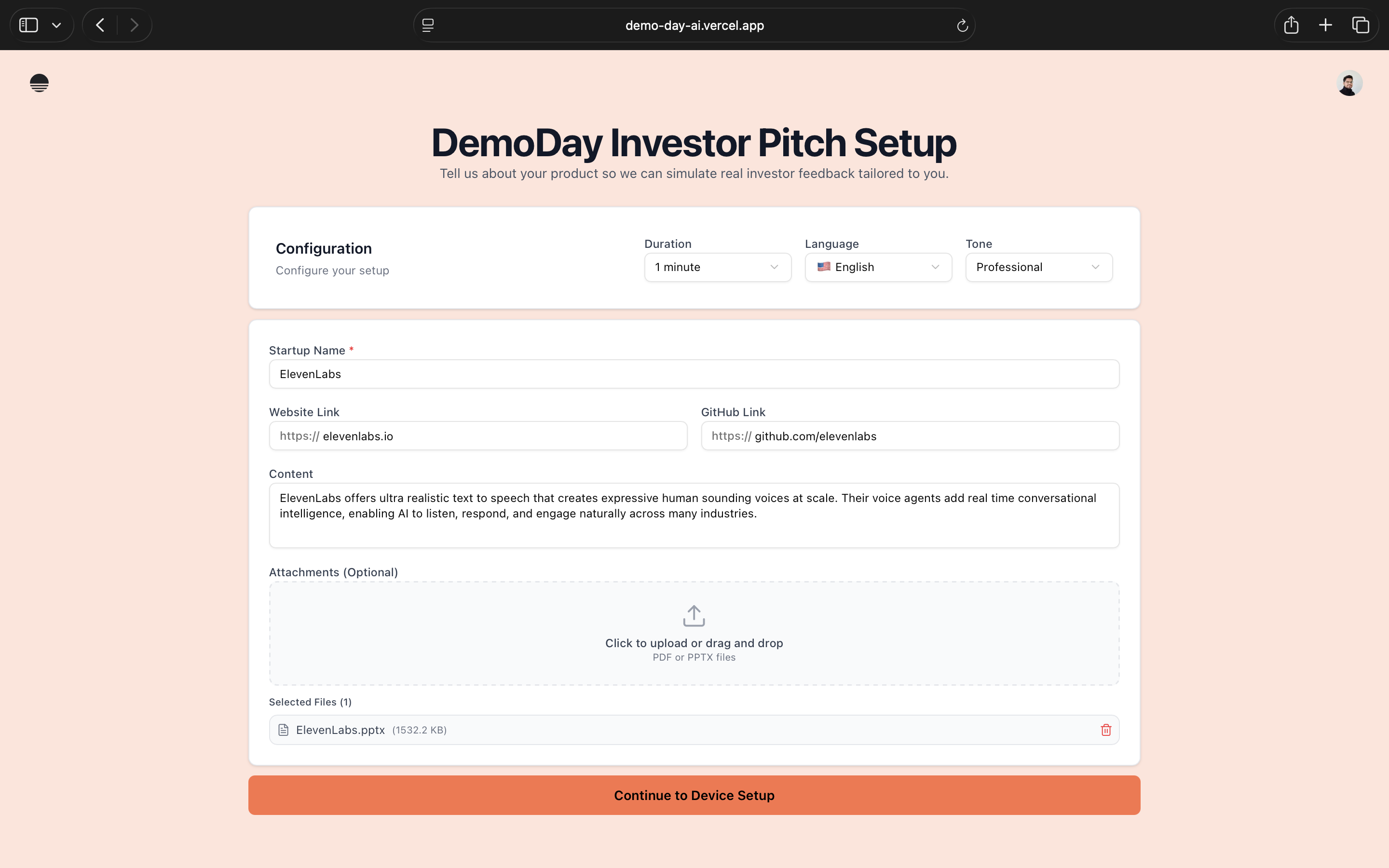 DemoDay AI is a voice-first AI pitch coach platform for founders that simulates a real investor meeting end to end. Founders deliver their pitch out loud, face realistic VC-style follow-up questions and receive actionable, structured feedback on clarity, structure, fundability and concrete next steps—so they can iterate fast before real investor conversations.
