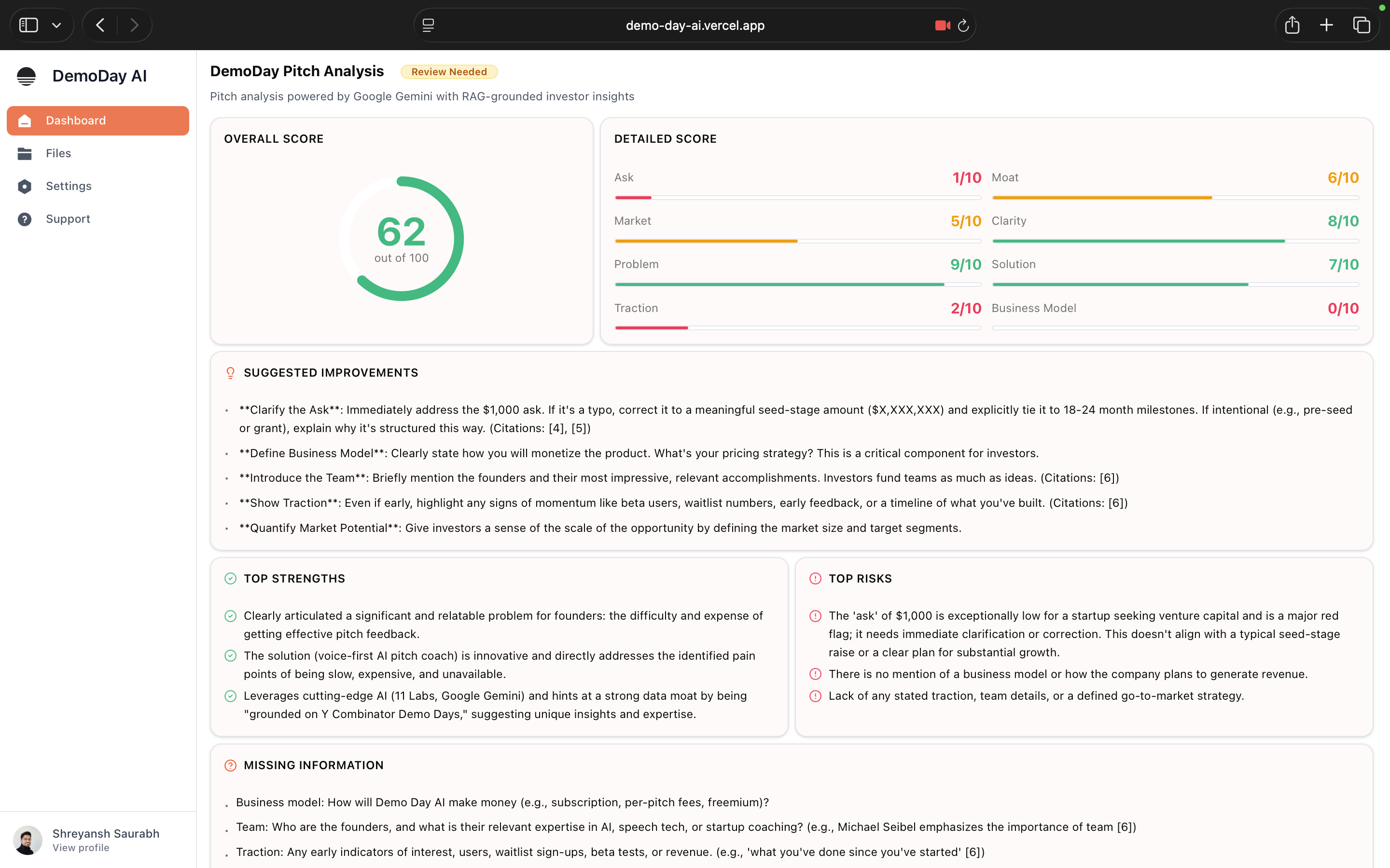 - Category scores (clarity, problem, traction, market, ask, etc.)