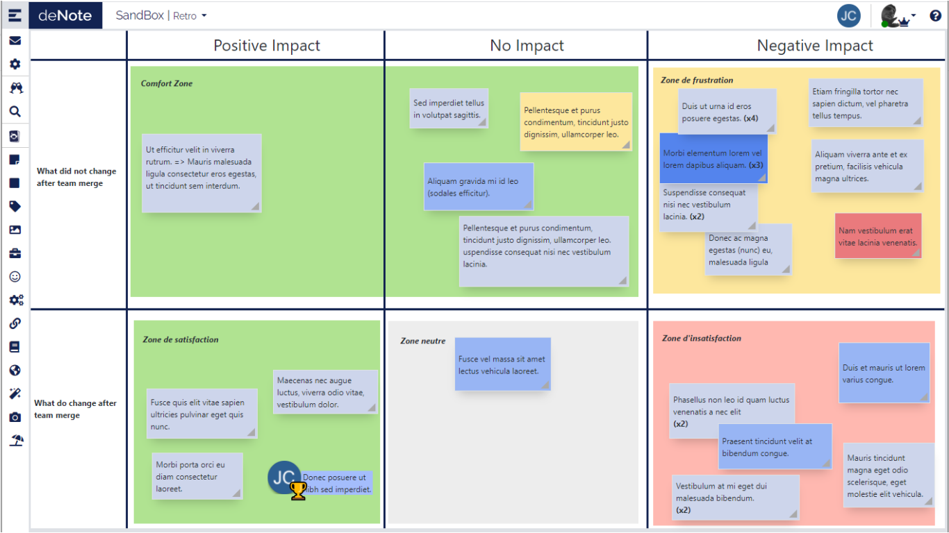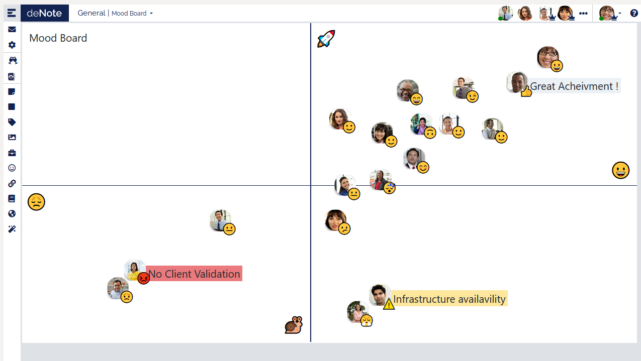 N-Shores teams need to share information and collaborate through several projects. deNote is a virtual paper board where elements are stickers, can be pinned up and are updated live on all user's screens.