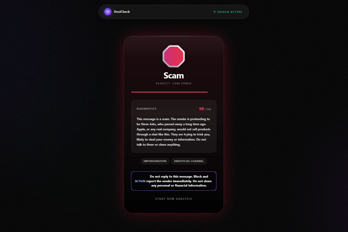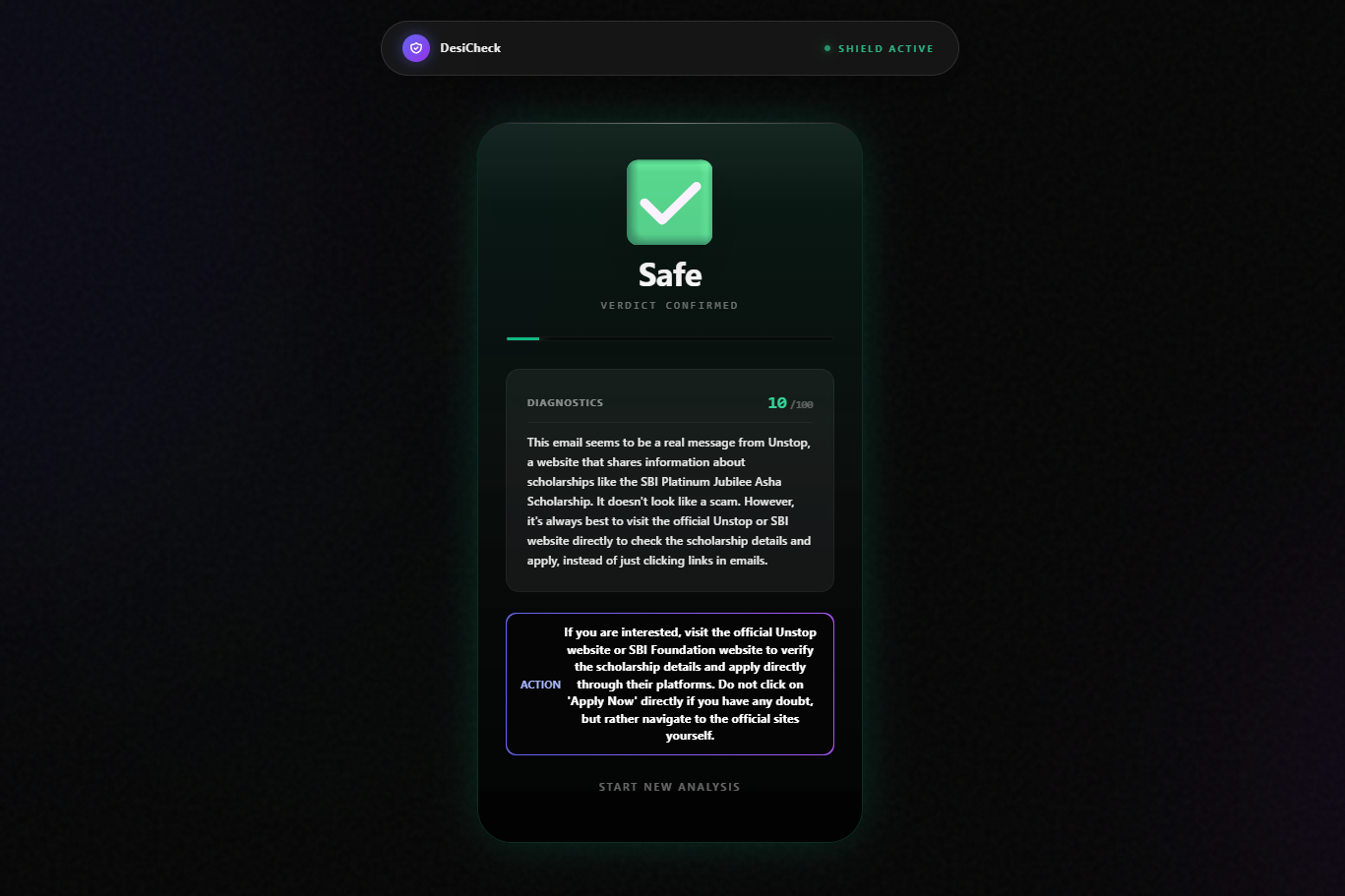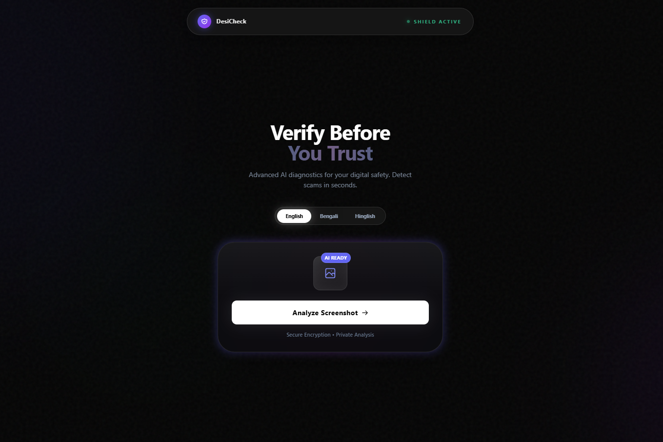 DesiCheck functions as an intelligent barrier between the user and potential cyber threats. It is a Progressive Web App (PWA) that provides three layers of defense: