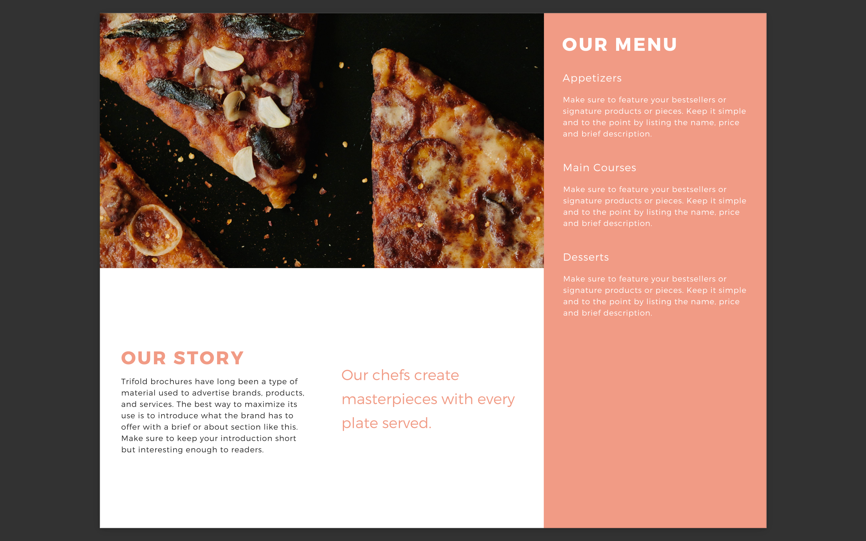 Brochure Brochure What it does Its a new brochure design for a restaurant. How I built it It was built by combining many templates and elements. Built With canva