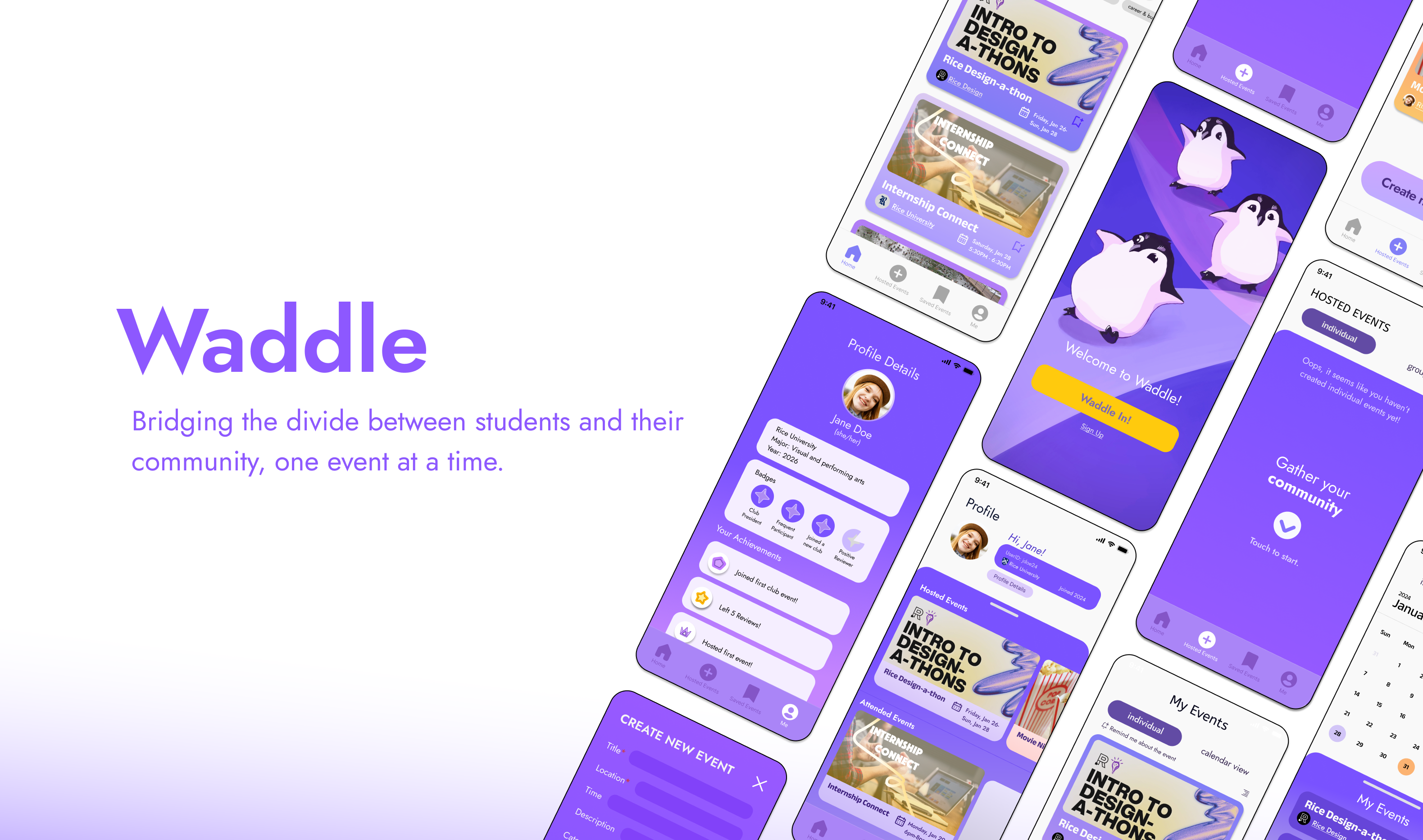 Describe your project Our app, Waddle, aims to bridge the divide between on-campus undergrad students and the vibrant events on and around their campuses by condensing resources for community and educational engagement onto one accessible and dynamic platform. Although Waddle is a virtual platform that aims to solve a social challenge, it encourages students to step outside of their normal schedules and habits to not only experience, but to actively gather new communities that trigger new conversations through in-person interactions. From career fairs to school clubs to personal hobbies, events that may help a student’s personal growth and connection with their campus and local communities will be right within reach. Each event they attend will be their source of learning, and each event they create will be their source of courage. So Waddle in!