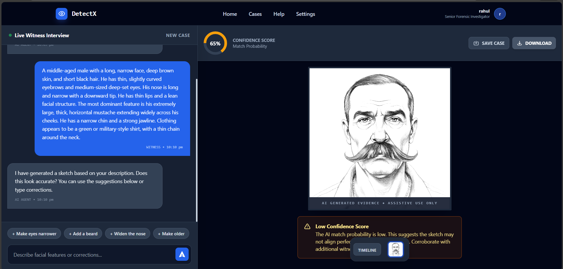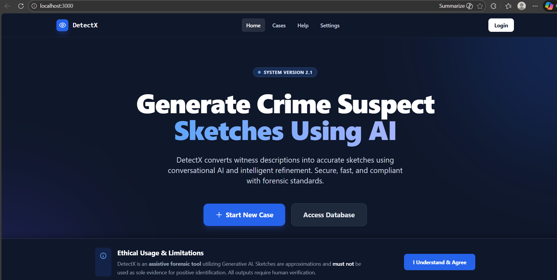 Police investigations often depend on eyewitness descriptions to identify suspects. Creating forensic sketches manually takes time and skilled artists, and delays can affect investigations. We were inspired to build Detect-X to quickly convert a person’s description into a visual sketch using AI, helping investigators act faster.