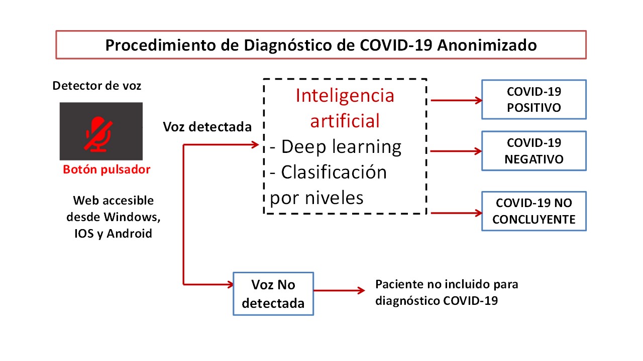 First, it is necessary to compile a database that contains audio samples from different groups, symptomatic infected people, asymptomatic infected people, people without infection but presenting similar symptoms due to other conditions, or people without infection and without symptoms. For this we have prepared a web page for hospital use, which we are finishing adjusting, which will be accessible from any electronic device with Windows, iOS or Android, with a push button and a set text for the patient to make his diction. Additionally, a Covid-19 questionnaire will be completed according to medical criteria.
