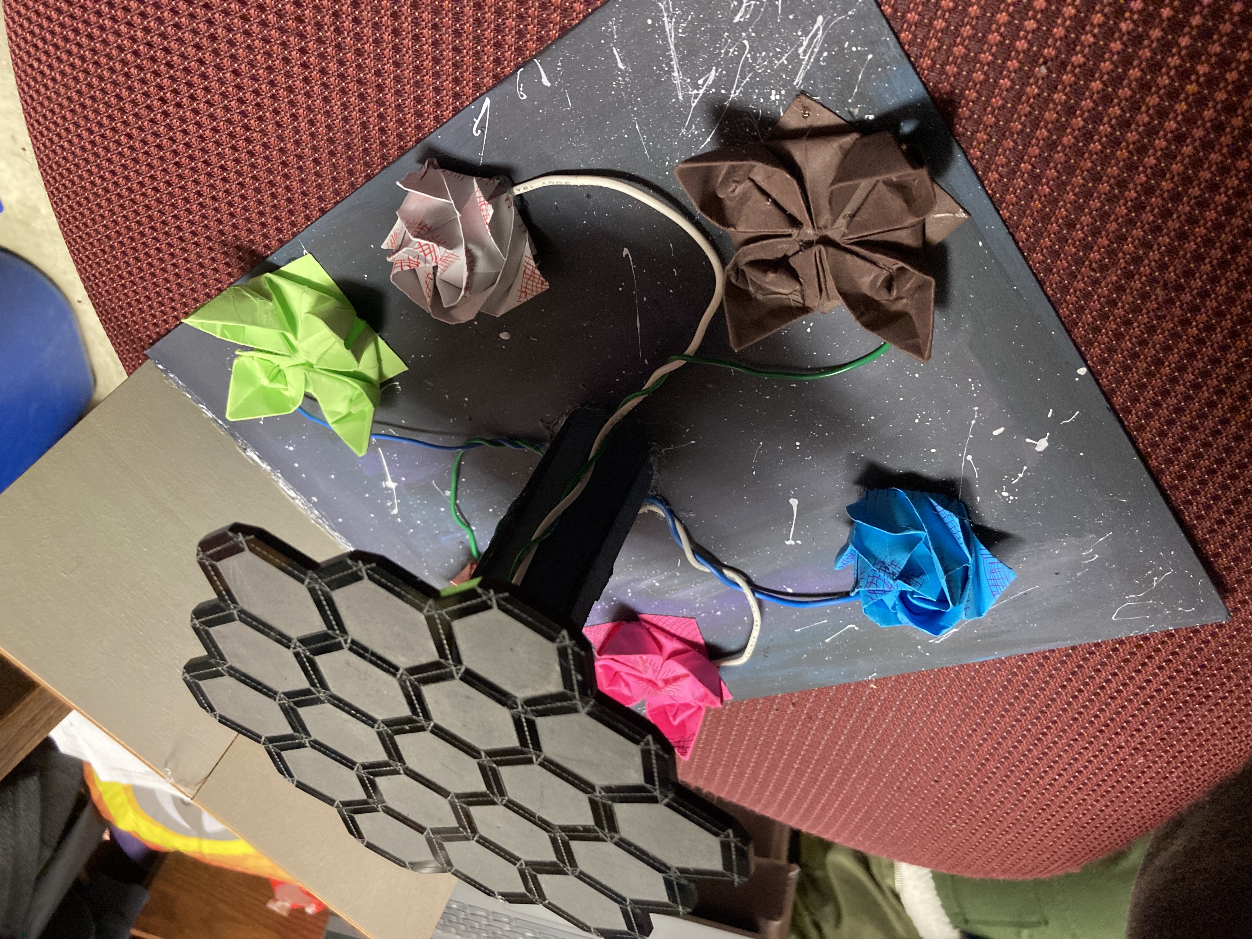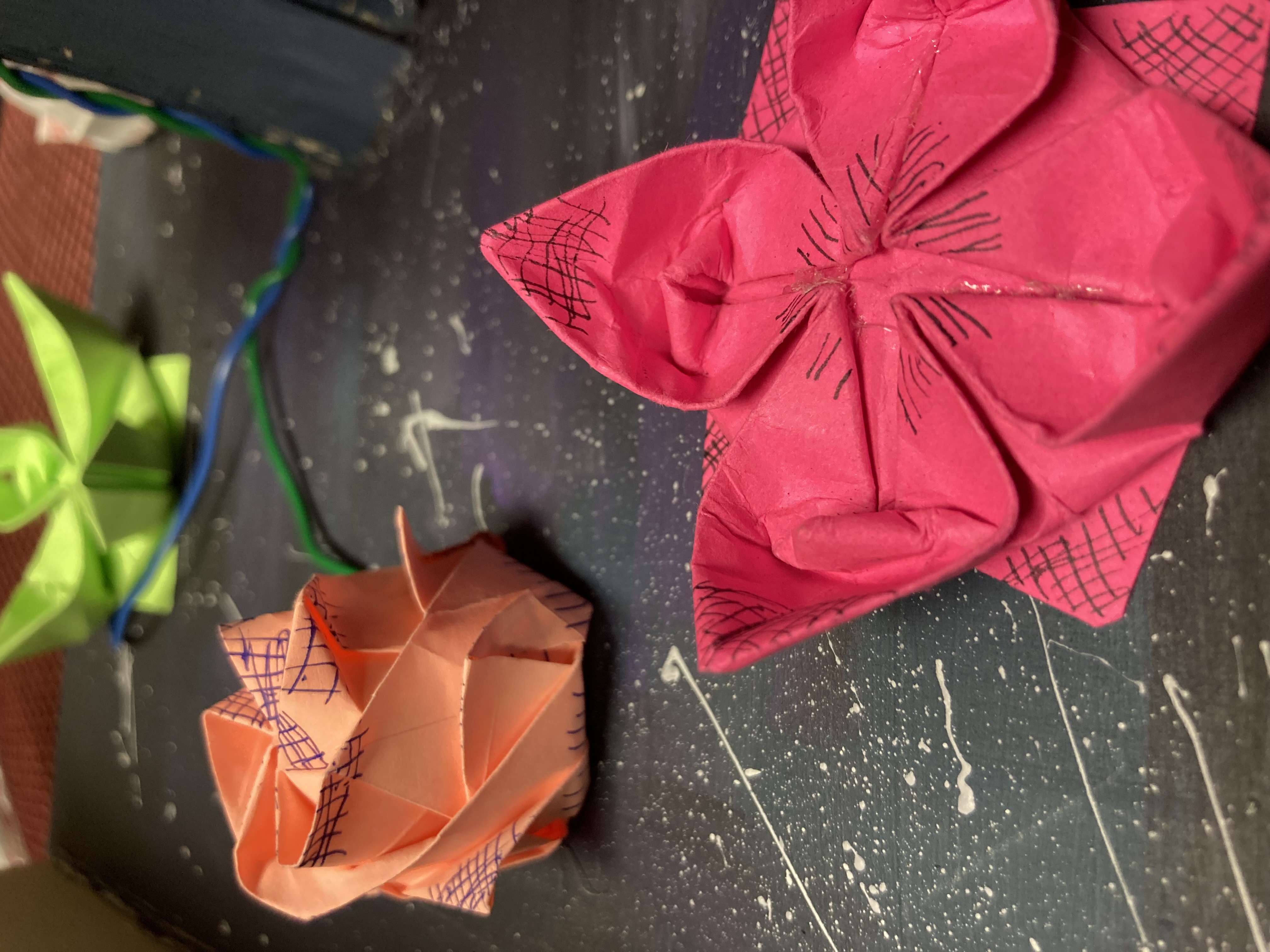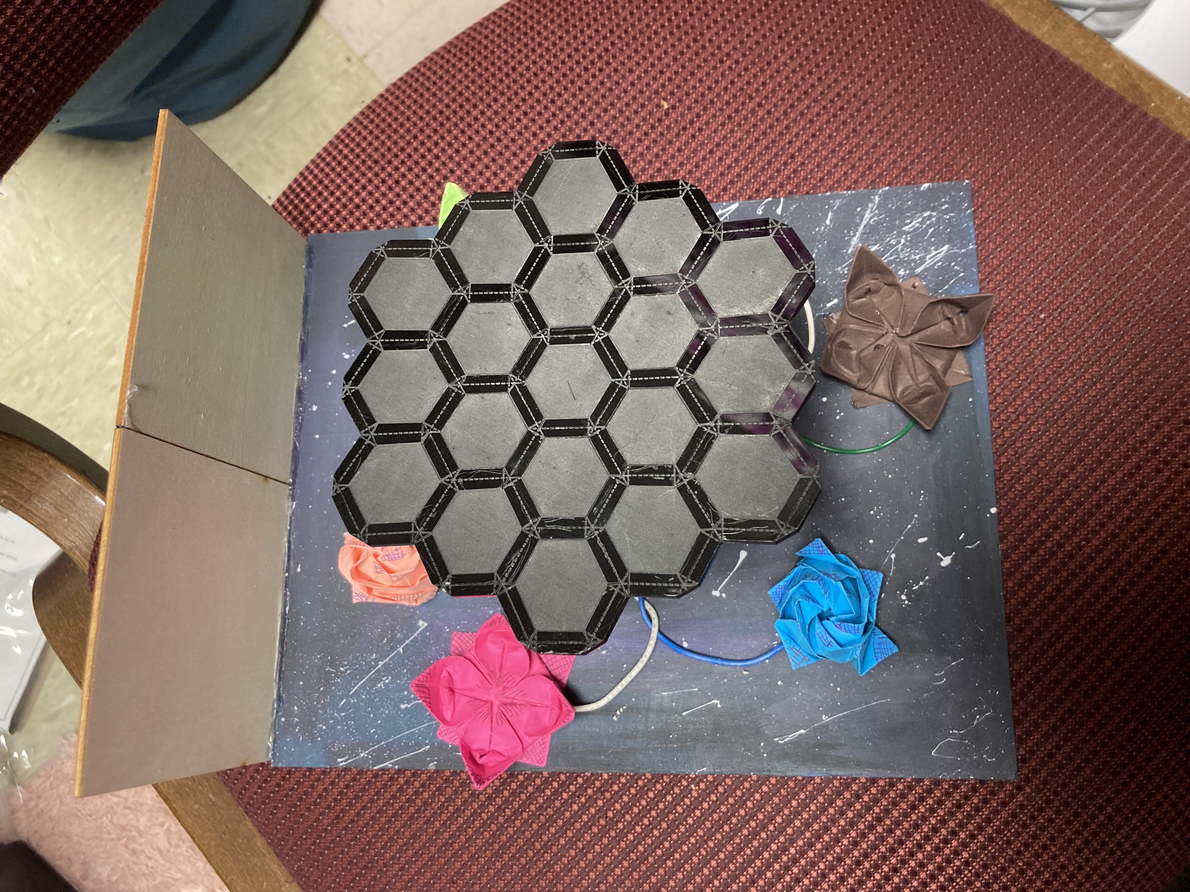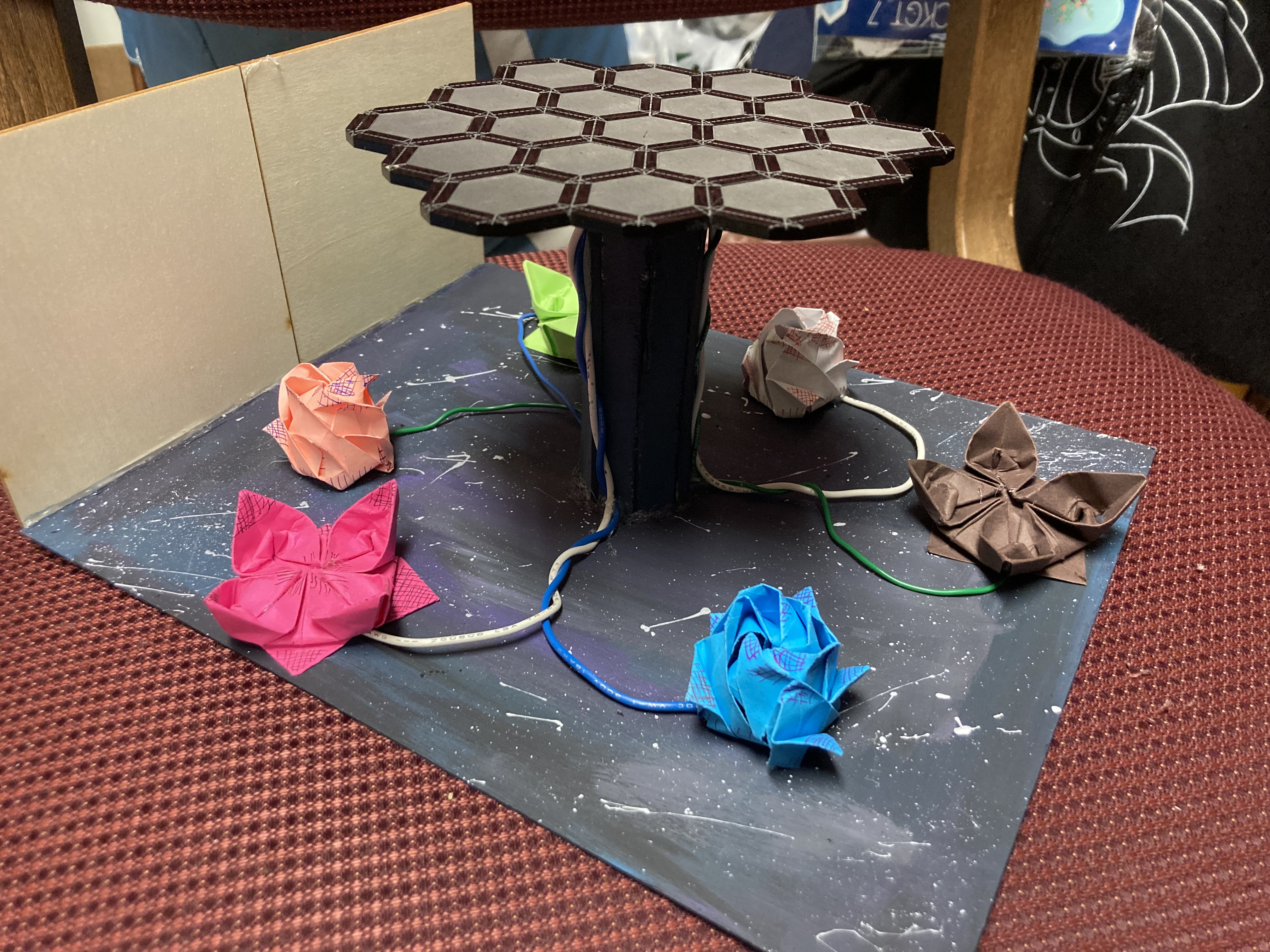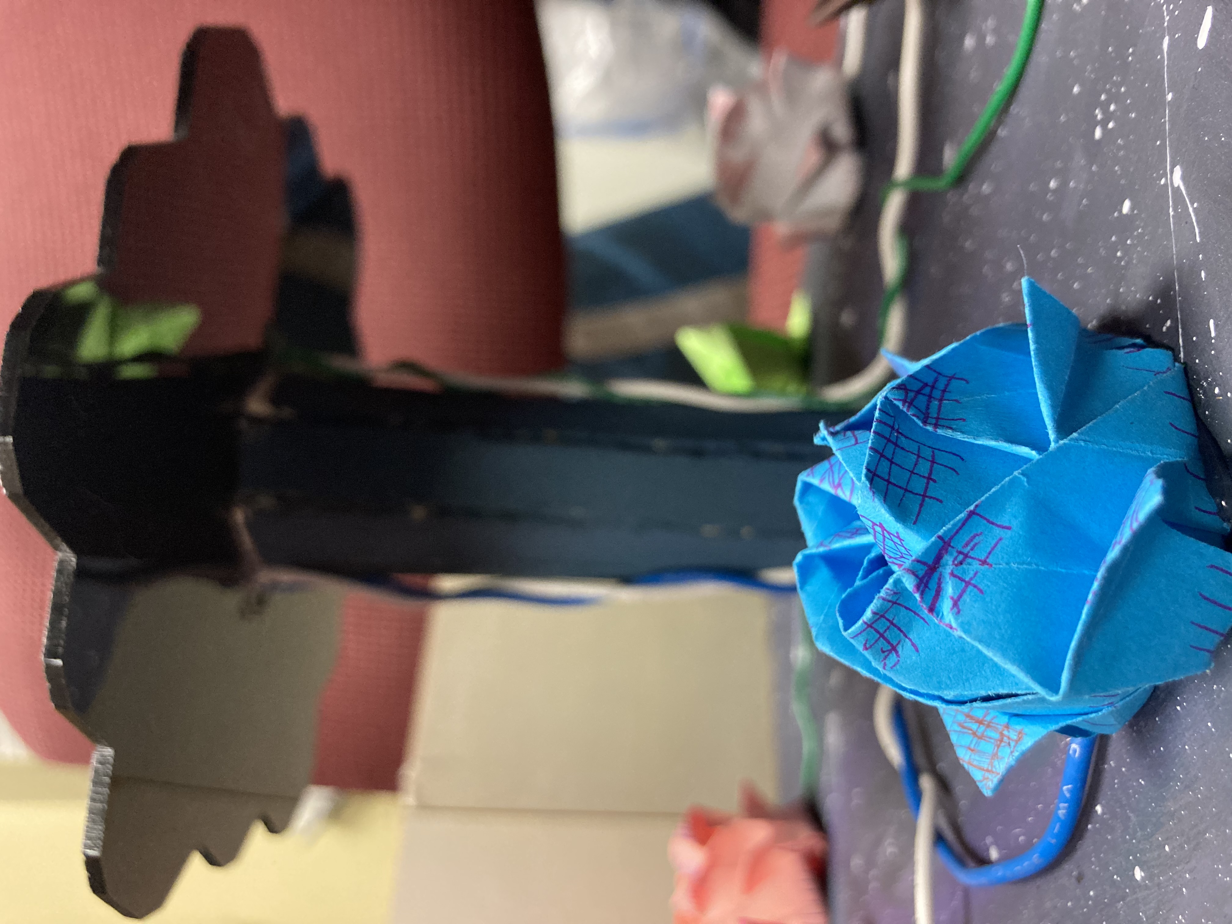 I made the base of the model from an acrylic sheet and used acrylic paint to make the background look like ~space~. I used wooden plating for the back of the model as well the the trunk of the "tree" part of the model". For the top of the "tree" I decided to used a laser-cut image of the origami tessellation pattern from the James Webb telescope, complementing the space-themed background. From the top of the "tree", I had electrical wires running from the tree to origami roses and lotuses, representing the connection between the modern, integrated origami, and traditional paper origami. These origami flowers were hot glued to the base of the model.