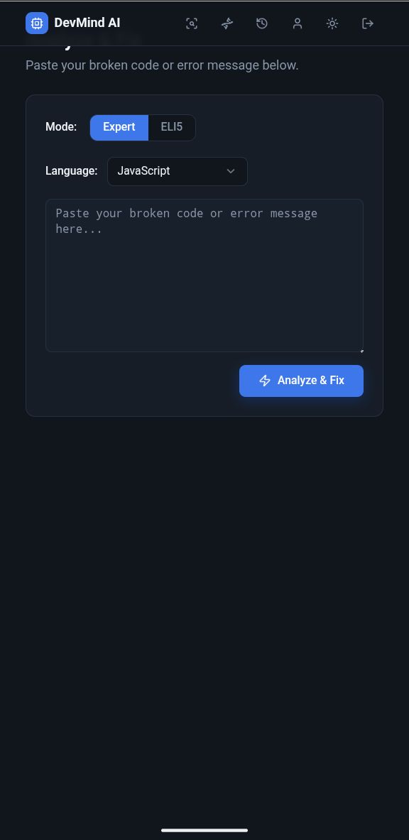 DevMind AI is a context-aware debugging assistant. Paste broken code, get the root cause, the exact fix, and a clear explanation tailored to your stack and experience level. Scan entire files for bugs before they hit production. Share fixes with a single link. And Debug DNA tracks your mistake patterns over time turning your fix history into personal growth insights.