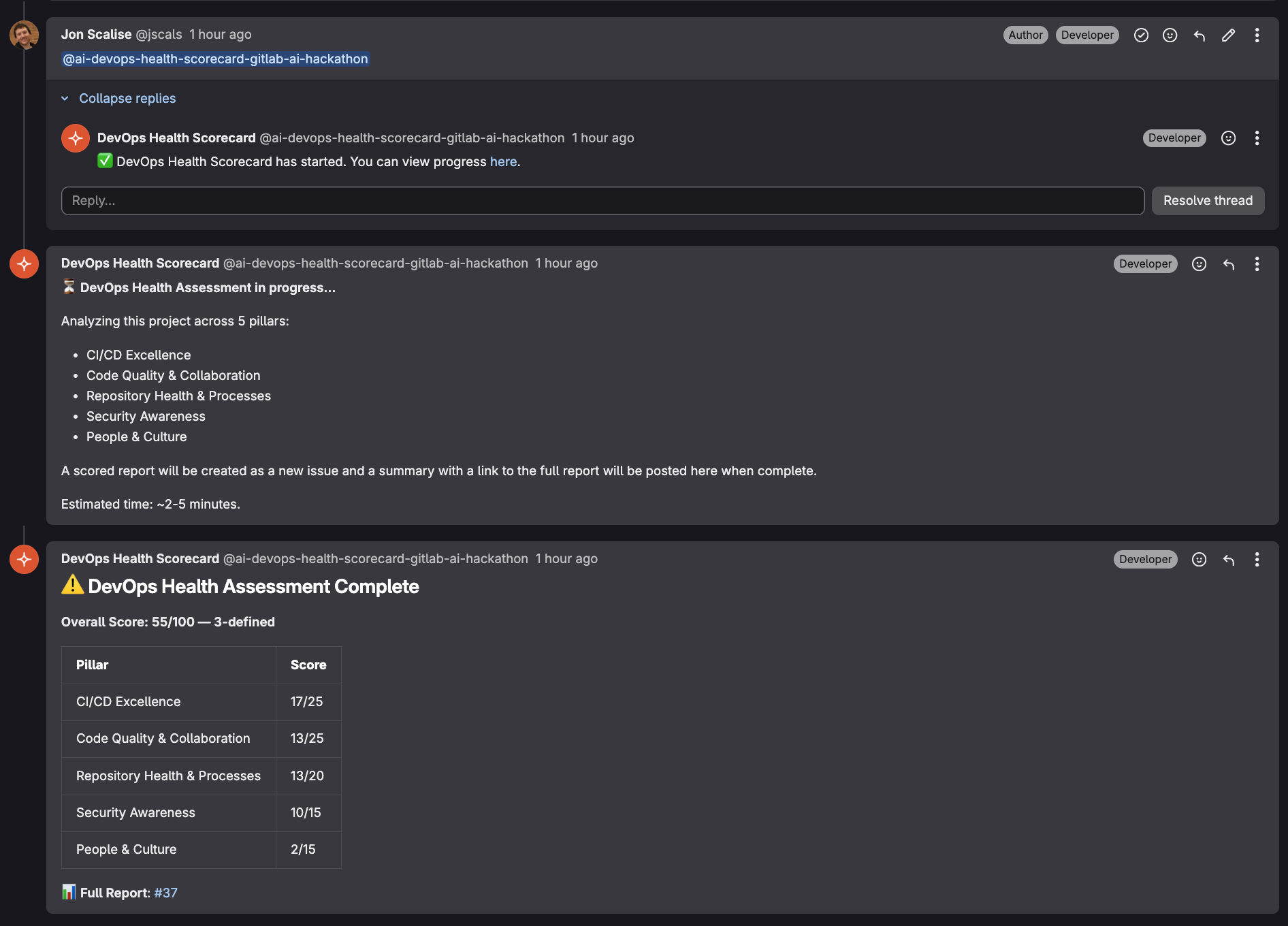 On any GitLab work item in your project, you can mention the bot user, and it will go off and make a variety of measured API and tool calls, gather all the information, and based on 26 individual signals within 5 pillars it will generate a full health report.
