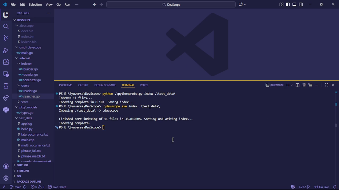 DevScope is a from-scratch, high-performance search engine for source code and application logs. Built entirely in Go—without external search libraries—it implements: