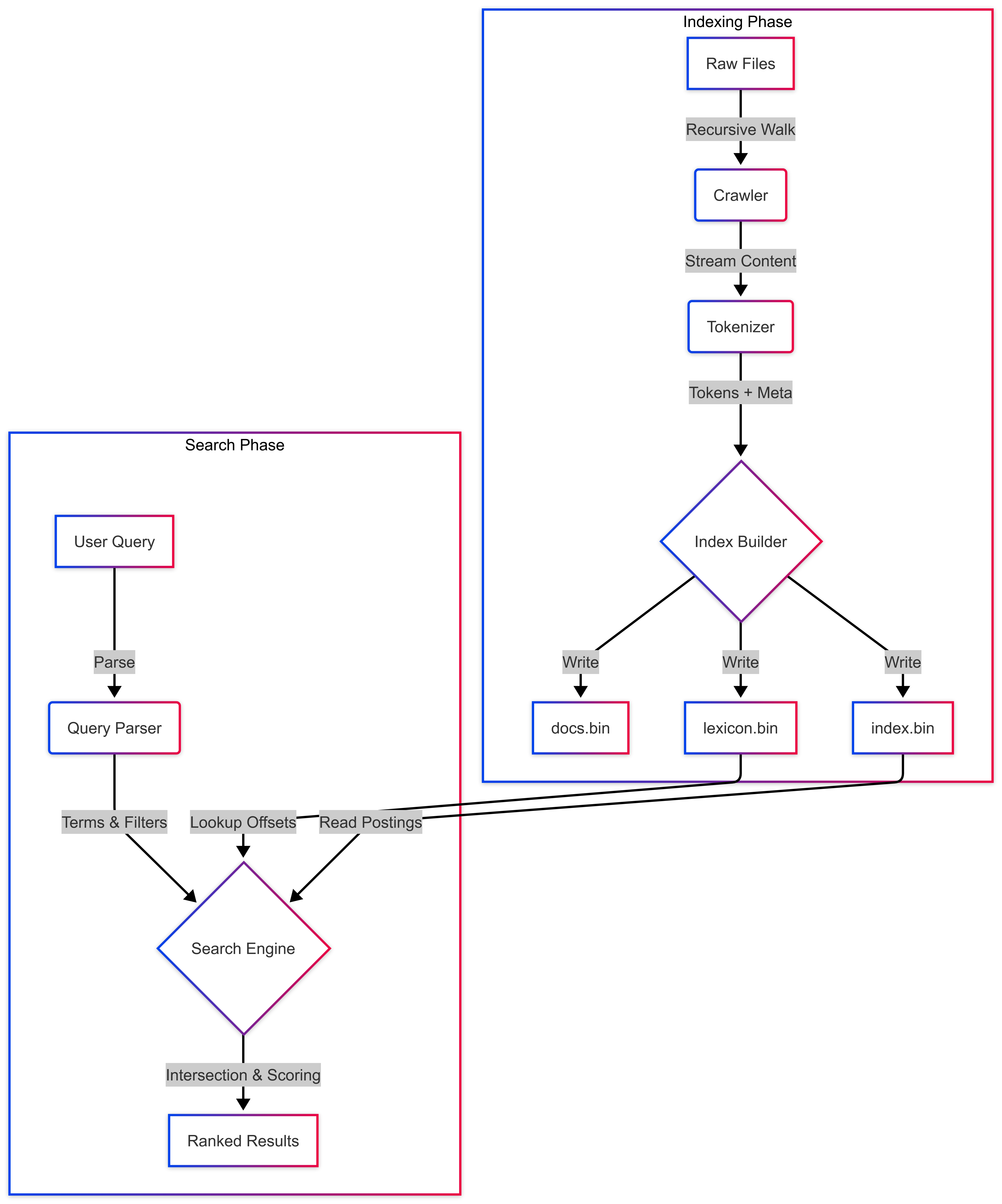.binfile formats (docs,lexicon,index) for minimal storage and fast disk seeks - Inverted index architecture: Positional posting lists enabling exact phrase matching (e.g.