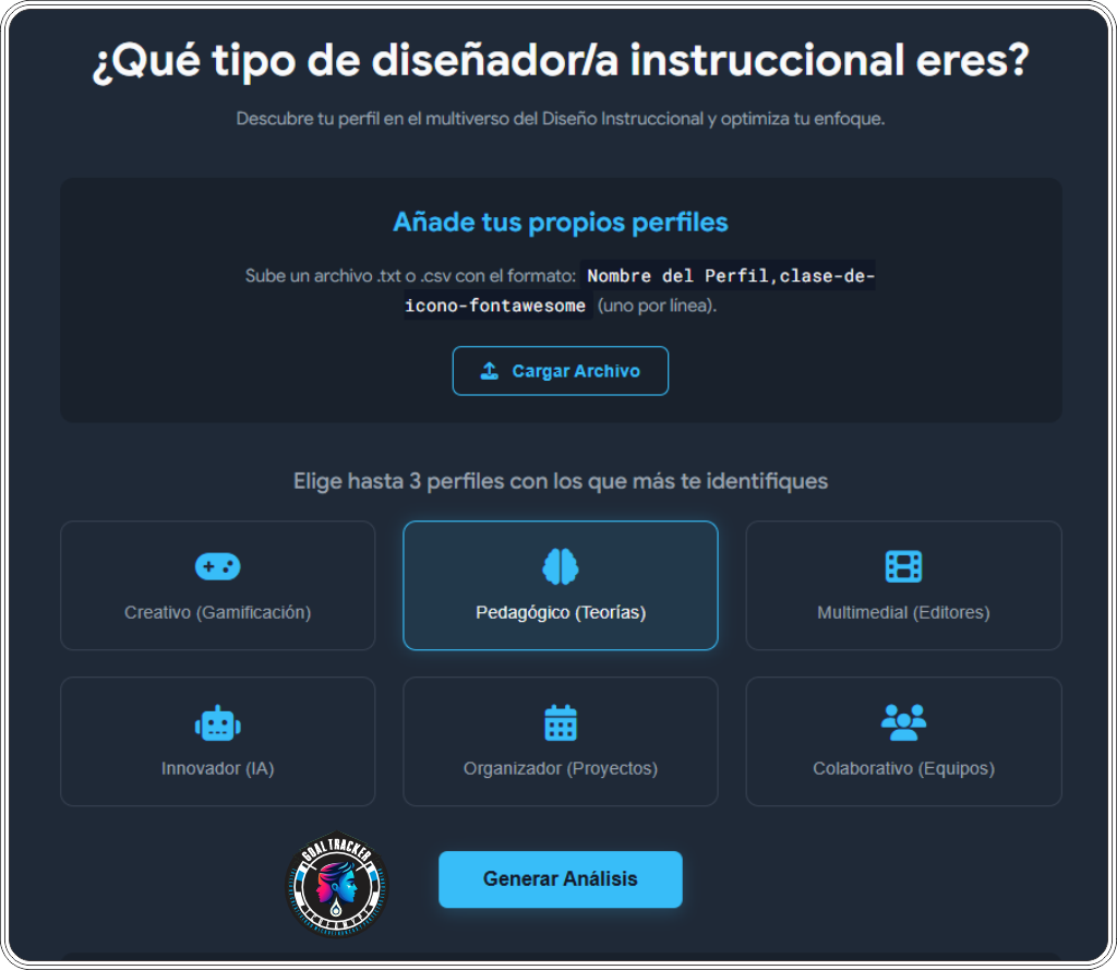 DI Multiverse: Perfilador de Diseño Instruccional 💡 Inspiration Como diseñadores instruccionales, notamos que los profesionales de e-learning carecen de herramientas especializadas para identificar sus fortalezas y áreas de mejora. Los tests de personalidad genéricos no capturan las habilidades únicas requeridas en el diseño educativo. DI Multiverse nace para llenar este vacío, combinando psicología del aprendizaje con IA generativa para ofrecer autoconocimiento profesional.