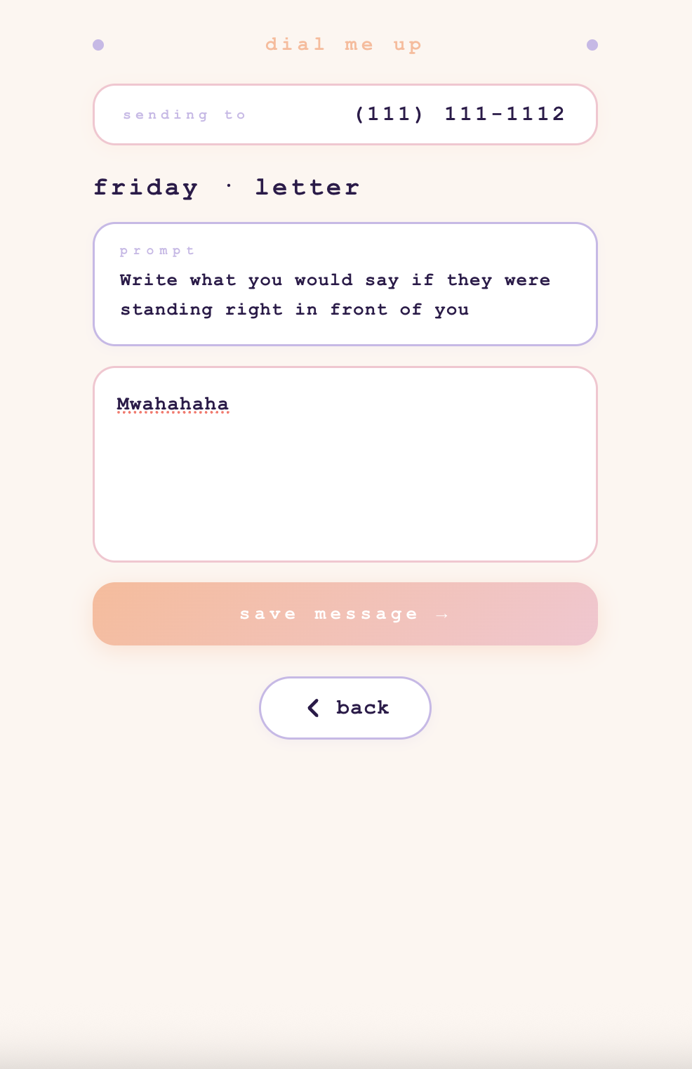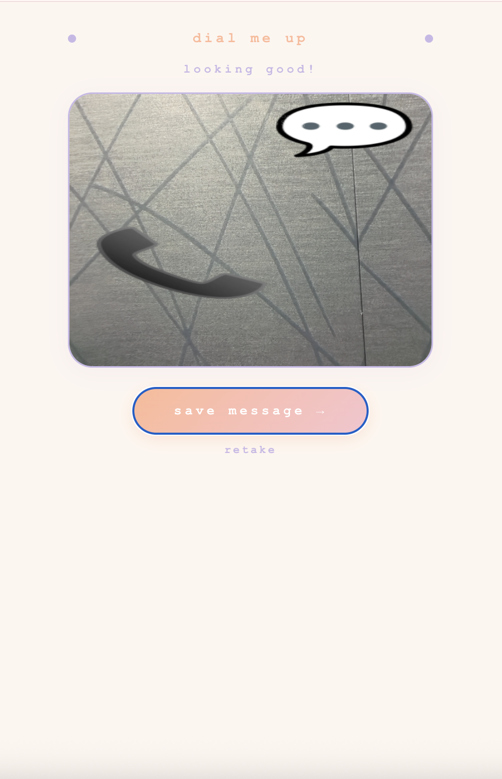 Our main framework is built on React + Vite. To store messages and passcodes, we used Firebase Firestore. We also used Lava API for the auto-generated message prompts and Web Audio API for dial tones and voice recording.