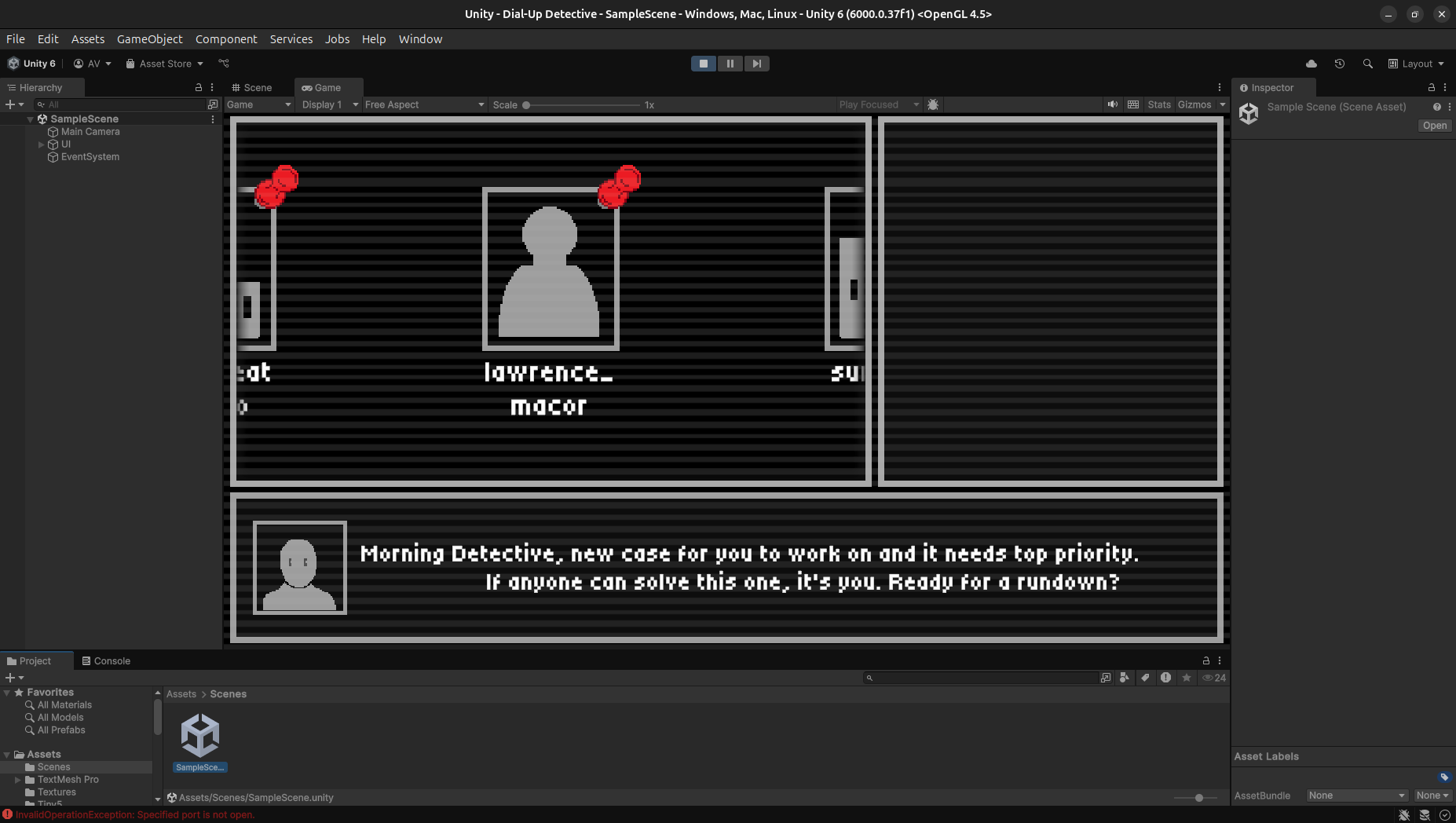 Lots of hardware and suffering to get a 60-year old phone to act as our controller for the game. We hand crafted a story and dialogue for 6 characters (With no AI involved at all!) Then, using Unity, we display our case using a digital pin-board inspired by the early GUIs of the late 70s. This GUI is hand drawn!