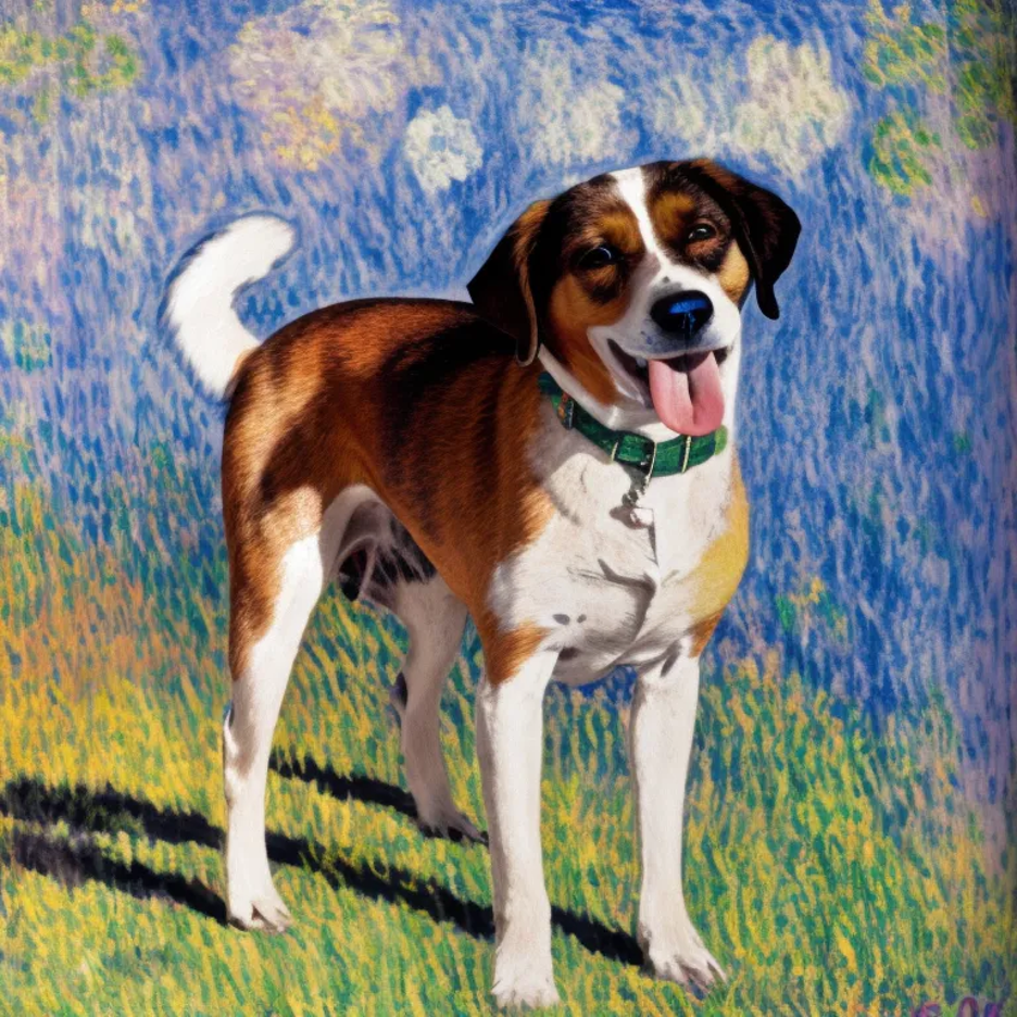 Next, we used images of Impressionist artworks by Claude Monet, optimizing a prompt with the PEZ algorithm and CLIP encoders. Finally, we combined Romeo the dog with these optimized prompts to generate new images of Romeo in the Impressionist style!