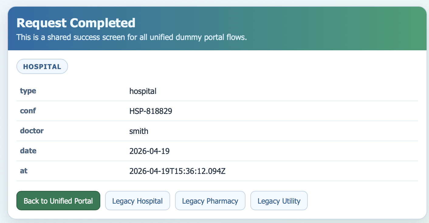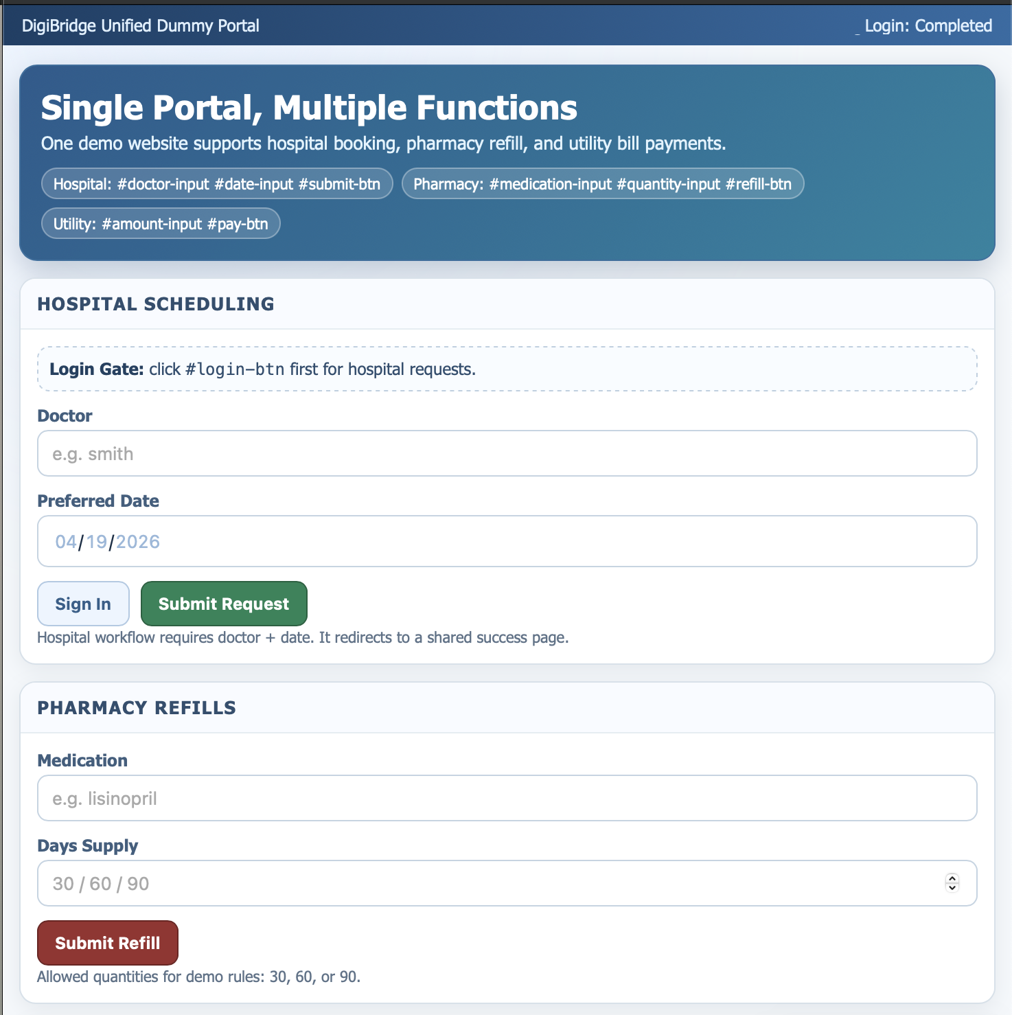 dummy portal with predictable id-tagged selectors, plus a