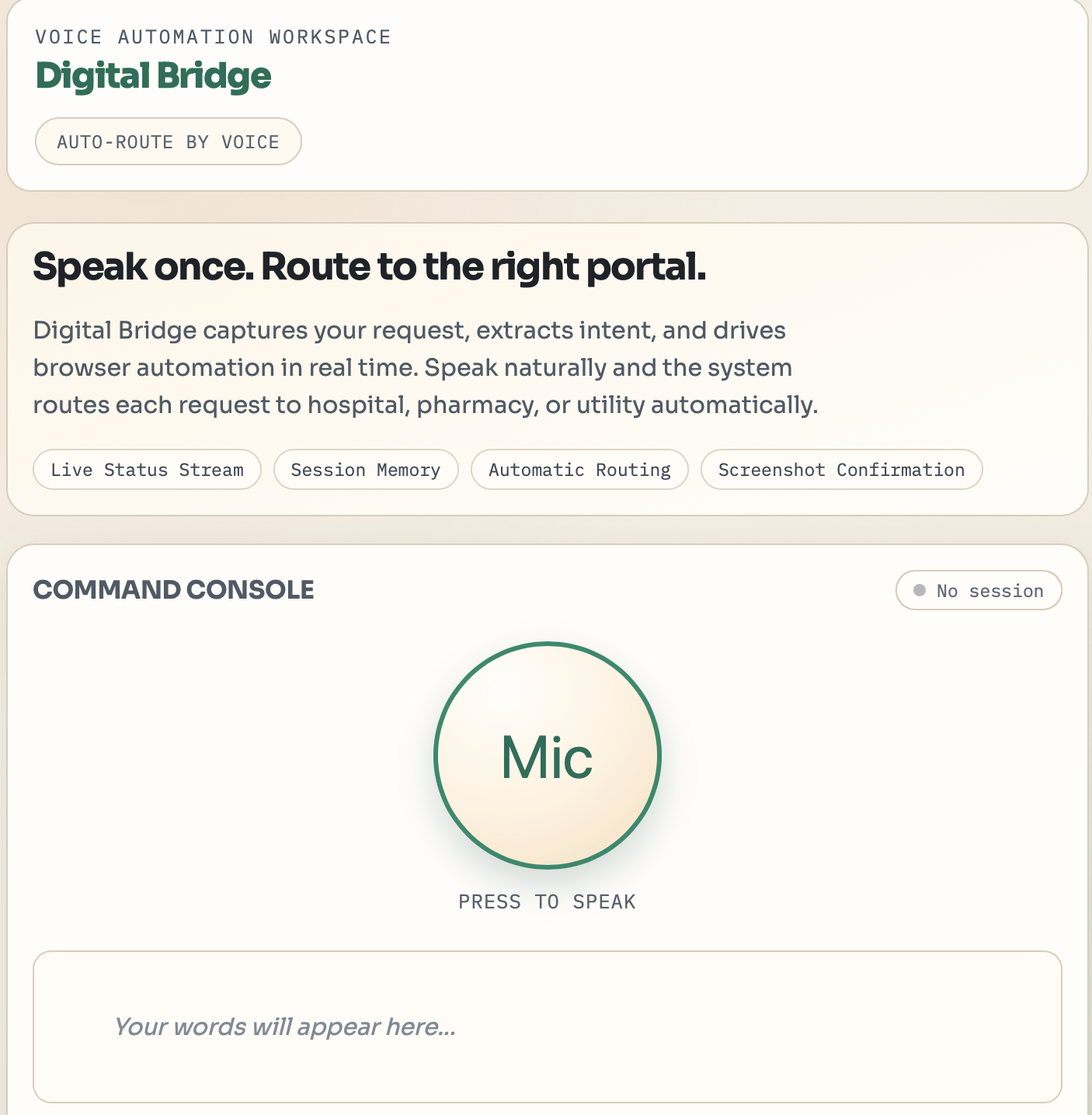 Digital Bridge is a voice-driven accessibility agent that translates natural language into real web actions. A user speaks a request, "I need to see Doctor Smith next Tuesday" , and the system handles everything: parsing intent, navigating the portal, filling forms, and submitting, returning a screenshot as proof of completion.