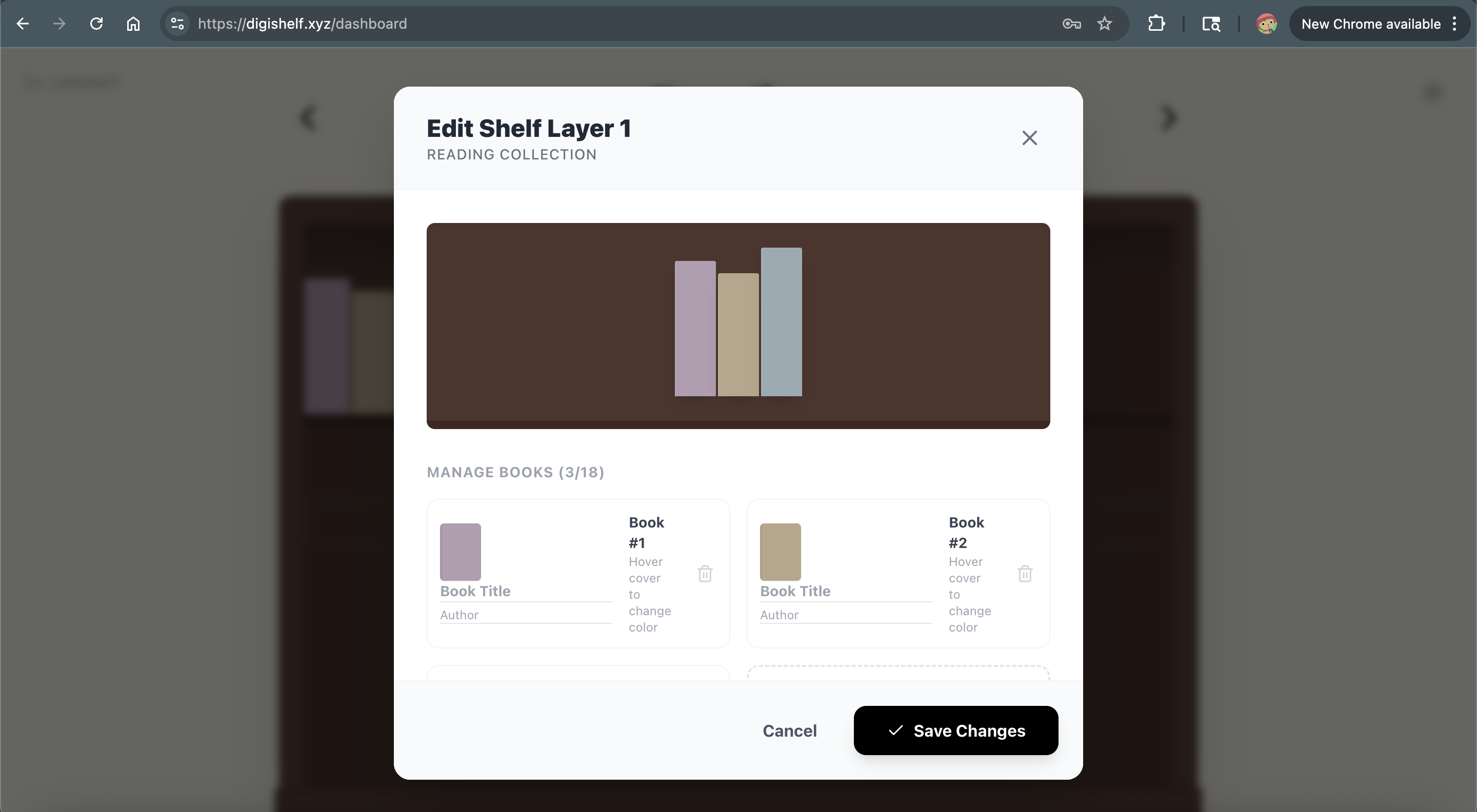 DigiShelf is a digital library that stores all of the books that you may have read, categorized into 3 possible genre options. The library is customizable by color, amount of shelves and books, dark mode and name/author.