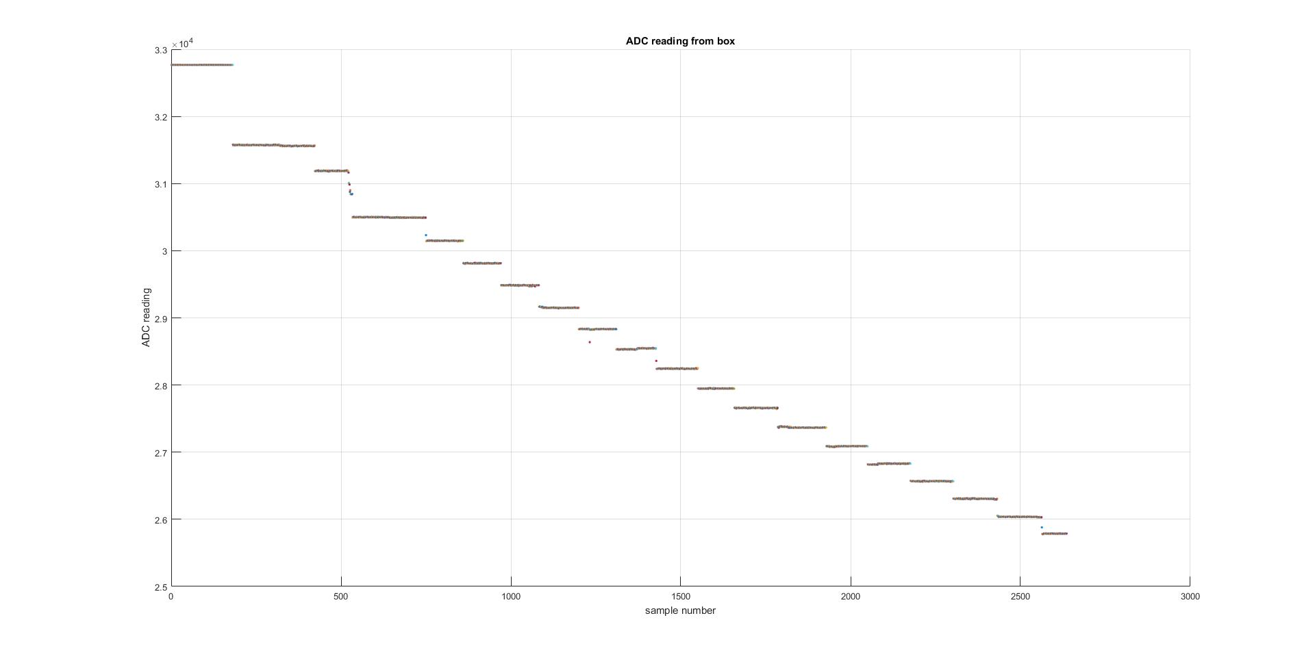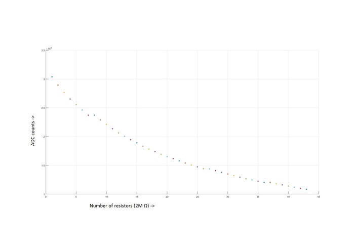 Log Meeting with Marcoo: The problem with the resistor measurement was when the number of resistor getting larger, the changing is the difference was hard to notice since the relationship between the parallel resistor and the total resistance is 1/x, so when the number of the resistor getting larger, the reading will be flat. So we need to come up with a way to increase the reading with a large number of resistors when water connected them into a circuit. ( potential ideas were, first, to make the total resistors changing relationship into linear. This could be done by having all the resistors in parallel with a pre-designed value so that when they were connected in parallel, the total resistance is to be linear. The cons of this solution were, some of the resistor value didn't exist. Second, another potential solution is to change the gain of our ADC reading. For now, our ADC reading has 4 gain change option, 1,2,4,8. So when the output reading was small, we could enlarge the gain of our ADC so the value reading from the ADC will be large enough to notice and used for further calculations.) Also, need to make some more new containers for testing.