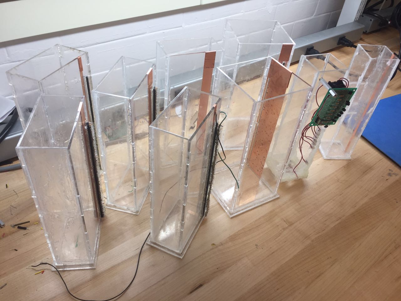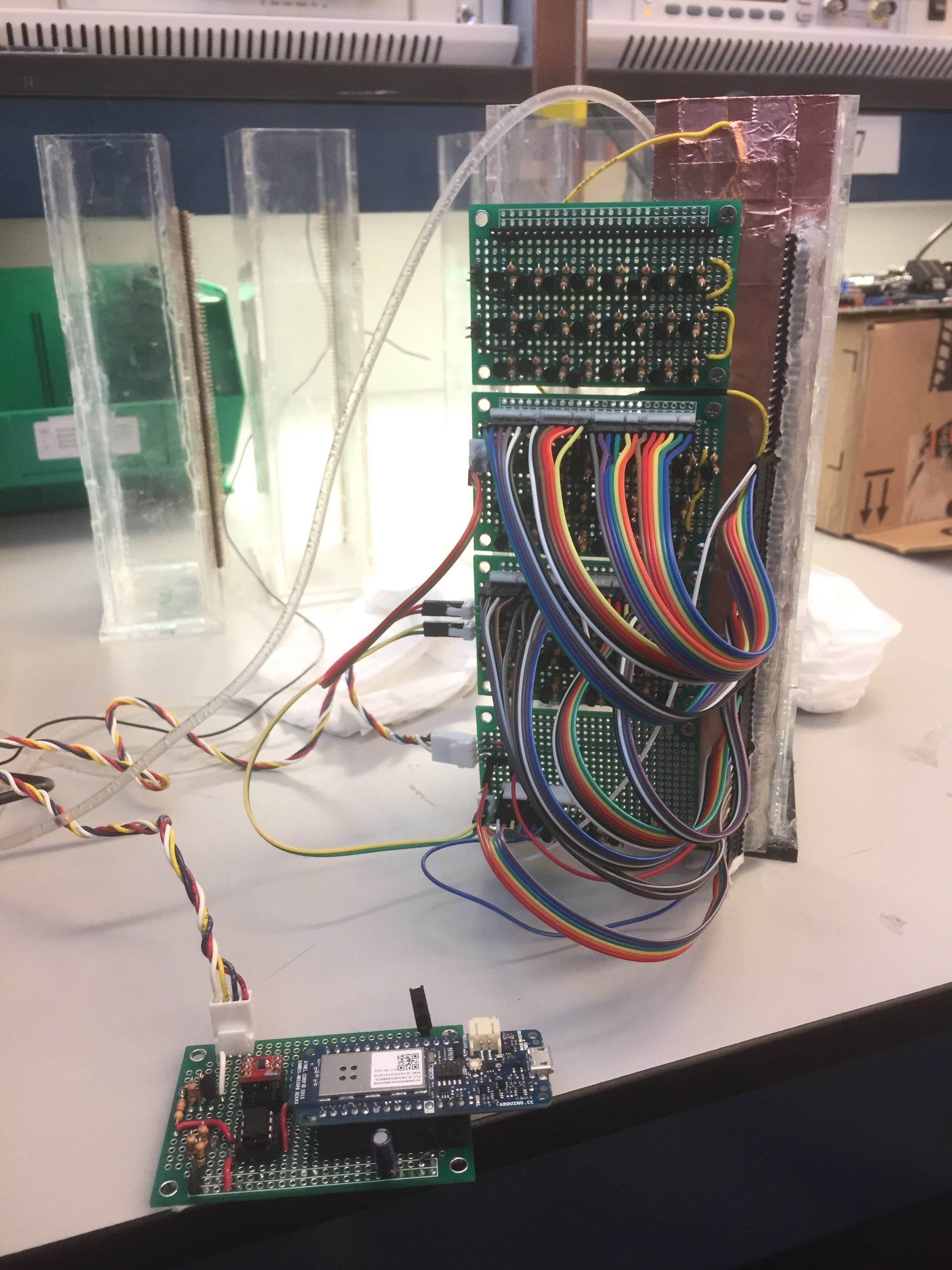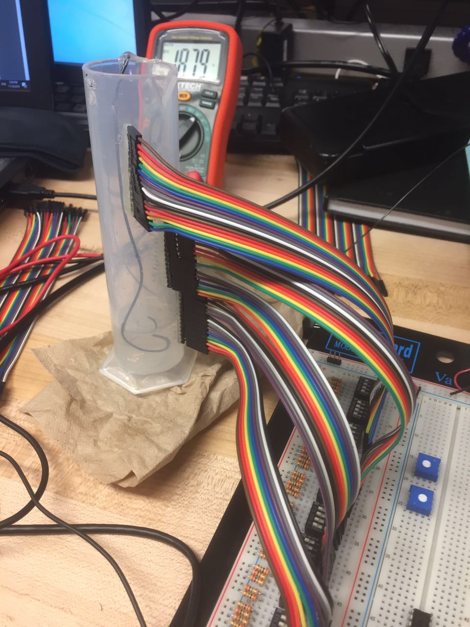 Log 11.4 Still tested with SCR prototype, there were some issues with the breadboard we used and the data reading from the SCR was not continuous. Need to fix the container configuration of we need to make a new container. I would like to also test with another idea which just using resistor through the container since if we could use large enough resistor, then the resistance through the water could be ignored and the overall design would be even simpler. Here was the test data with just using 9 resistors and connected through the water, the data seems good. Error rate compared with the calculation is around 1%.[https://drive.google.com/drive/u/4/folders/0B0_ygoe28VEuQ2dTMkN2azBNUW8] For this idea, we need to test a container with higher resolution, more pins, at least around 50 pins. If this idea works, then I prefer using this since we won't need to have any SCR in the circuit and there would only be 2 wires connected out from the container. But for this idea, a PCB is needed for more test prototype.