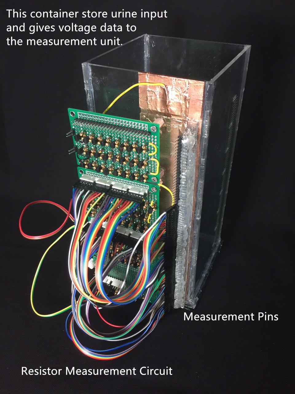 Our next iteration will involve building a container and adding a display and web server for our Urine meter. Also, we are working on improving the resistive method so that we can linearize the measurement rather the 1/x curve we currently have.