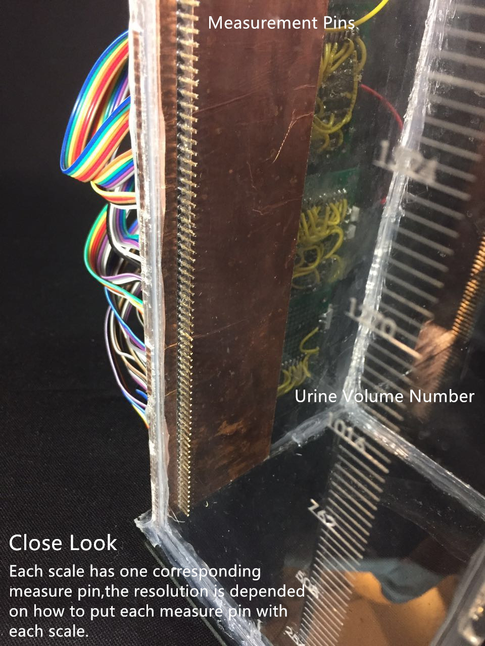 The second method uses a set of resistors that form a discrete measurement of fluid level. The urine simply completes the circuit and voltage output (across the resistor) is measured to give us an output. The main design consideration is to make sure that the solution leads to a minimum number of pins coming out of the container (in our case we have 3).