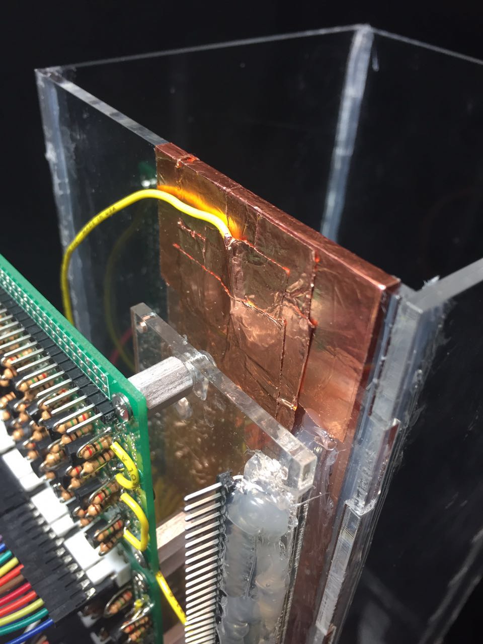 Beginning with the capacitive method, we used a self-designed sensor as shown above. Two large conductive sheets closely spaced (copper tape) which provides continuous measurement of the height of liquid within the container, and two small conductive sheets at the bottom of the sensor provide calibration for the system. Using a waveform generator, a sine wave is generated. The changing capacitance of the sensor (due to the change in liquid volume and hence dielectric permittivity) changes (causes a leading wave) which is measured and can be used to calculate the capacitance and in turn the liquid level.
