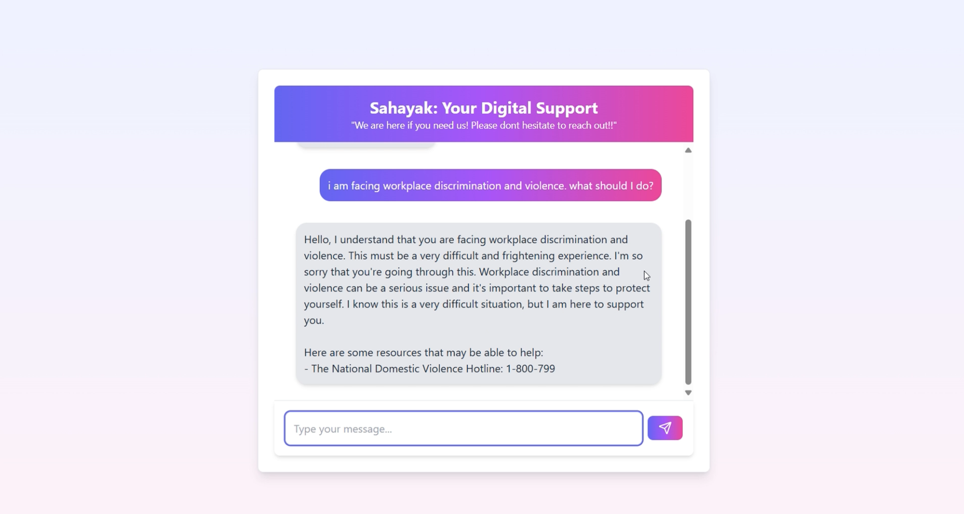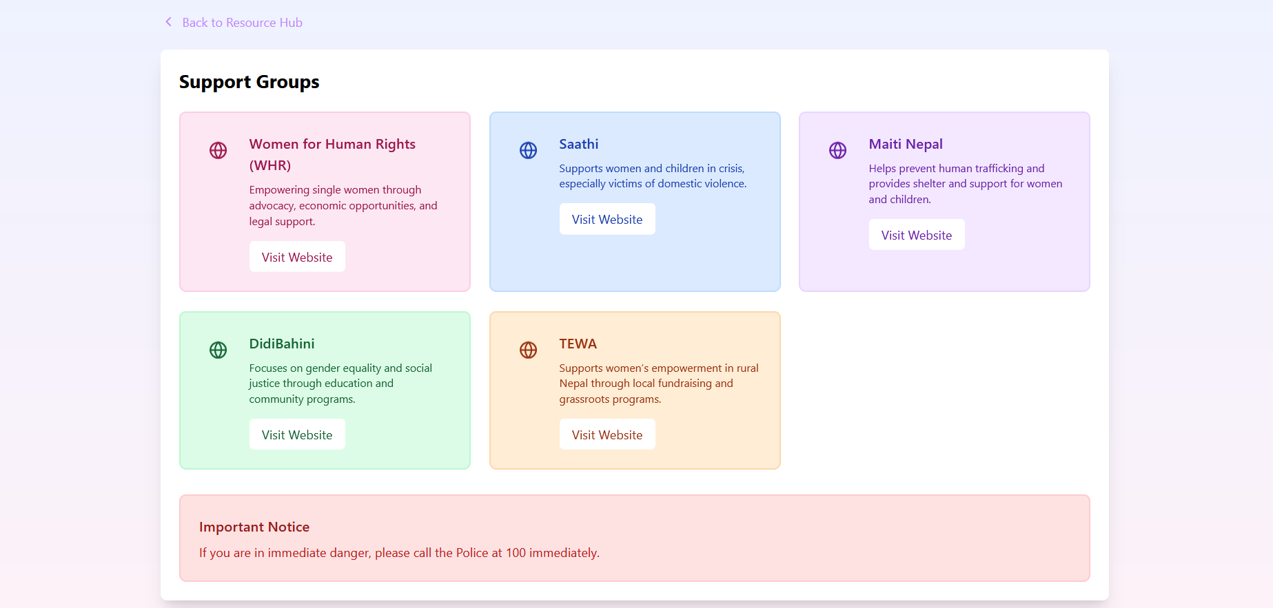 Collecting Support Group Information: Gathering reliable and up-to-date information on support groups, shelters, and legal resources was another obstacle. We’re actively working on expanding this information to ensure users have access to trustworthy and accessible support.
