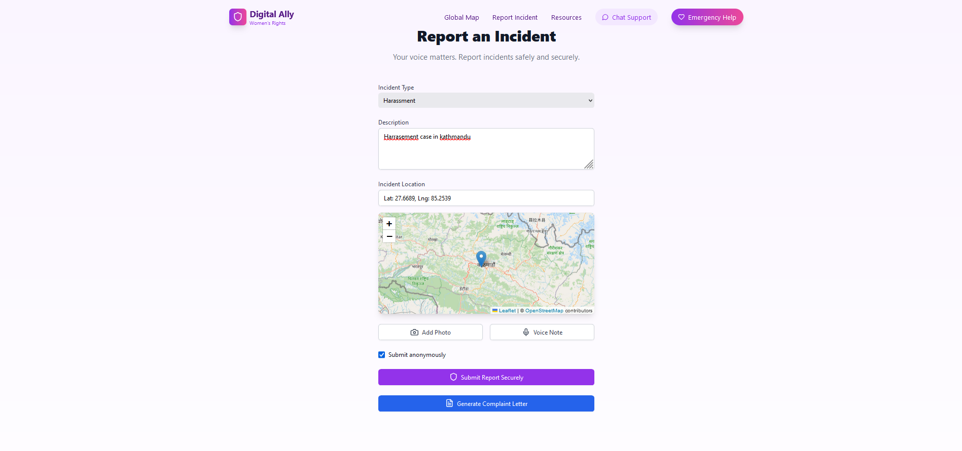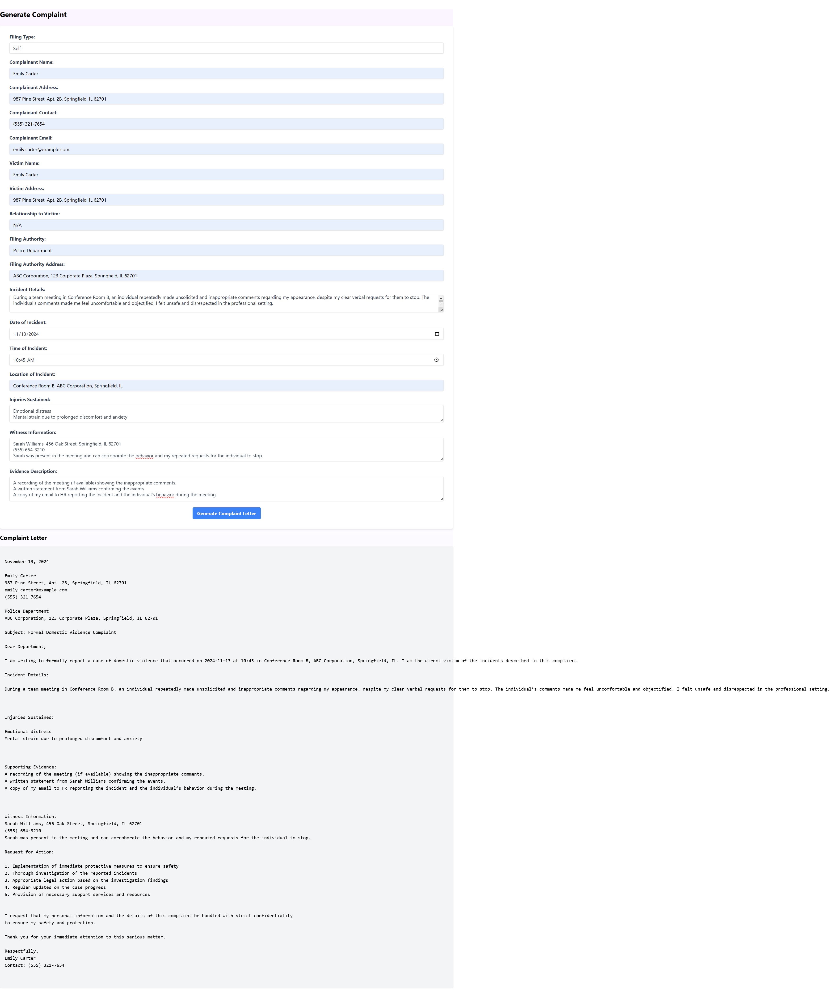 - Chatbot & Complaint Generation: Using Gemini's API, we implemented a chatbot to answer questions on rights and resources. The chatbot also assists in generating official complaint letters, offering a streamlined way to seek help or document abuse.