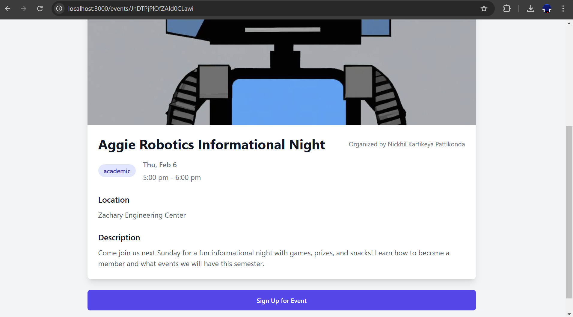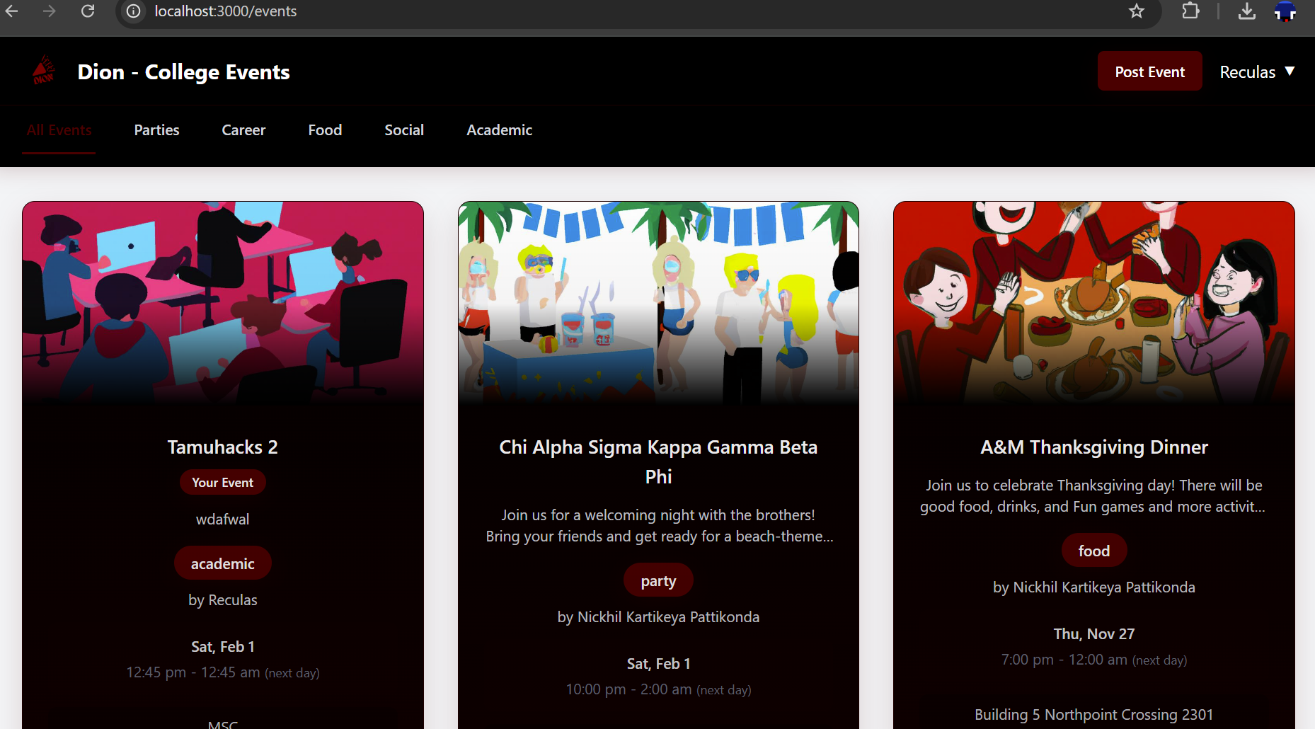 Our website was named after Dionysus, the Greek god of wine, fertility, and festivity. The inspiration behind creating Dion stemmed from our experience with club events, where I noticed how difficult it was to discover these events and how each required a different, often cumbersome, sign-up process. This simple, yet unacknowledged issue leaves students across TAMU clueless on what events are going on, both social and professional. Dion addresses this challenge by centralizing all event sign-ups on a single platform. This offers event organizers exceptional advertising opportunities and offers attendees a streamlined, centralized hub to discover and manage all their upcoming events and parties effortlessly.