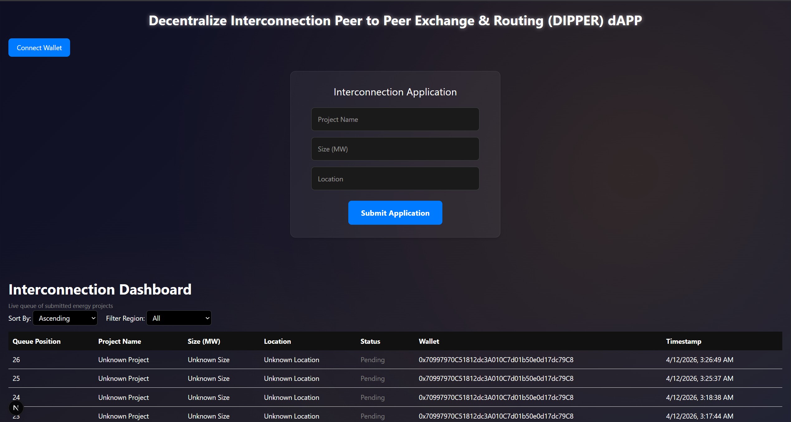 DIPPER is a decentralized application that simulates an interconnection queue for energy projects.