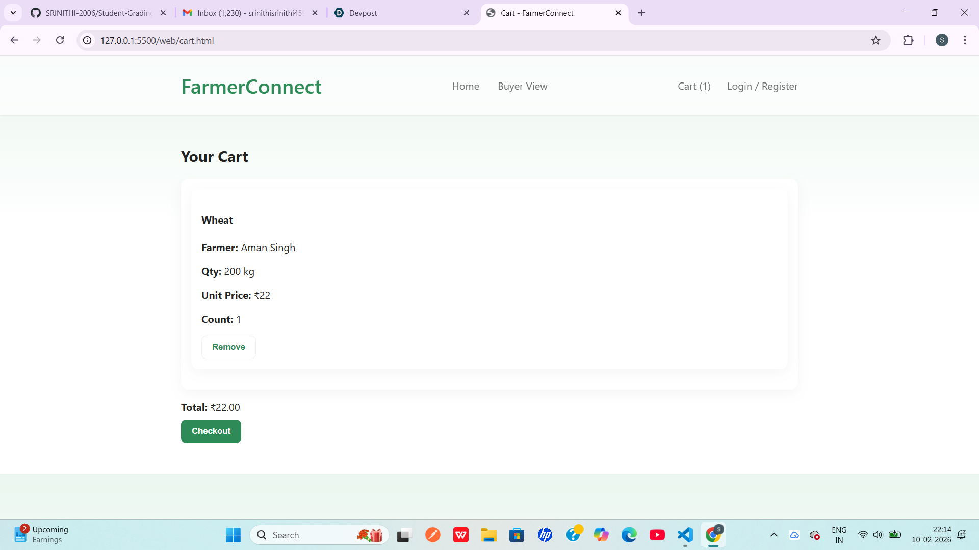 I built the project using Java, HTML, CSS, and MySQL. The frontend was designed with a clean and simple user interface to ensure ease of use for farmers. The backend logic was implemented in Java using JDBC to handle database operations. MySQL was used to store farmer and product details. The project was developed and enhanced during the hackathon with a focus on simplicity, usability, and scalability.