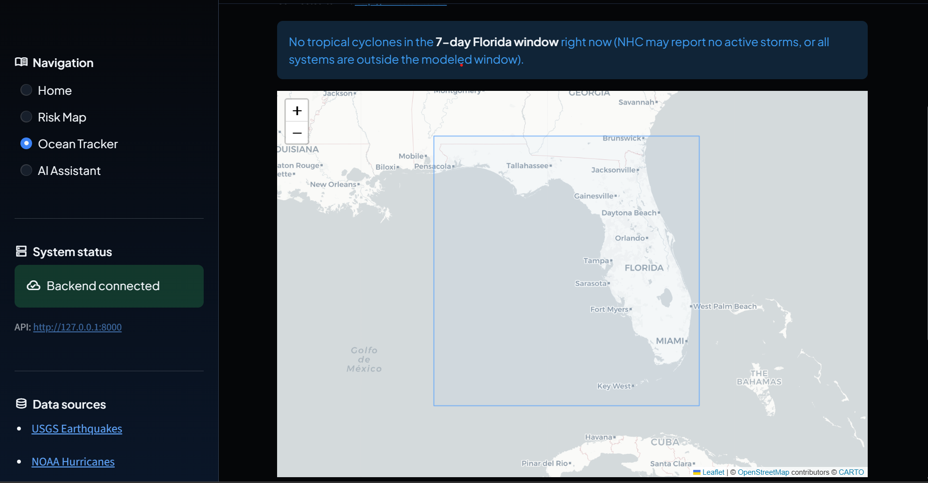 Live feeds — The API pulls USGS earthquake events near the peninsula (GeoJSON over httpx) and NOAA / NHC hurricane activity from their public JSON feed, so the UI can sit next to real institutional data, not only our model. Streamlit front end — A multi-page app (home, map, assistant-style flows) talks to FastAPI over HTTP, with styling and quick metrics so a demo reads clearly to judges and non-experts alike. Under the hood, the model uses wind speed, rainfall, and an encoded population-density band—the same feature contract from training through inference.