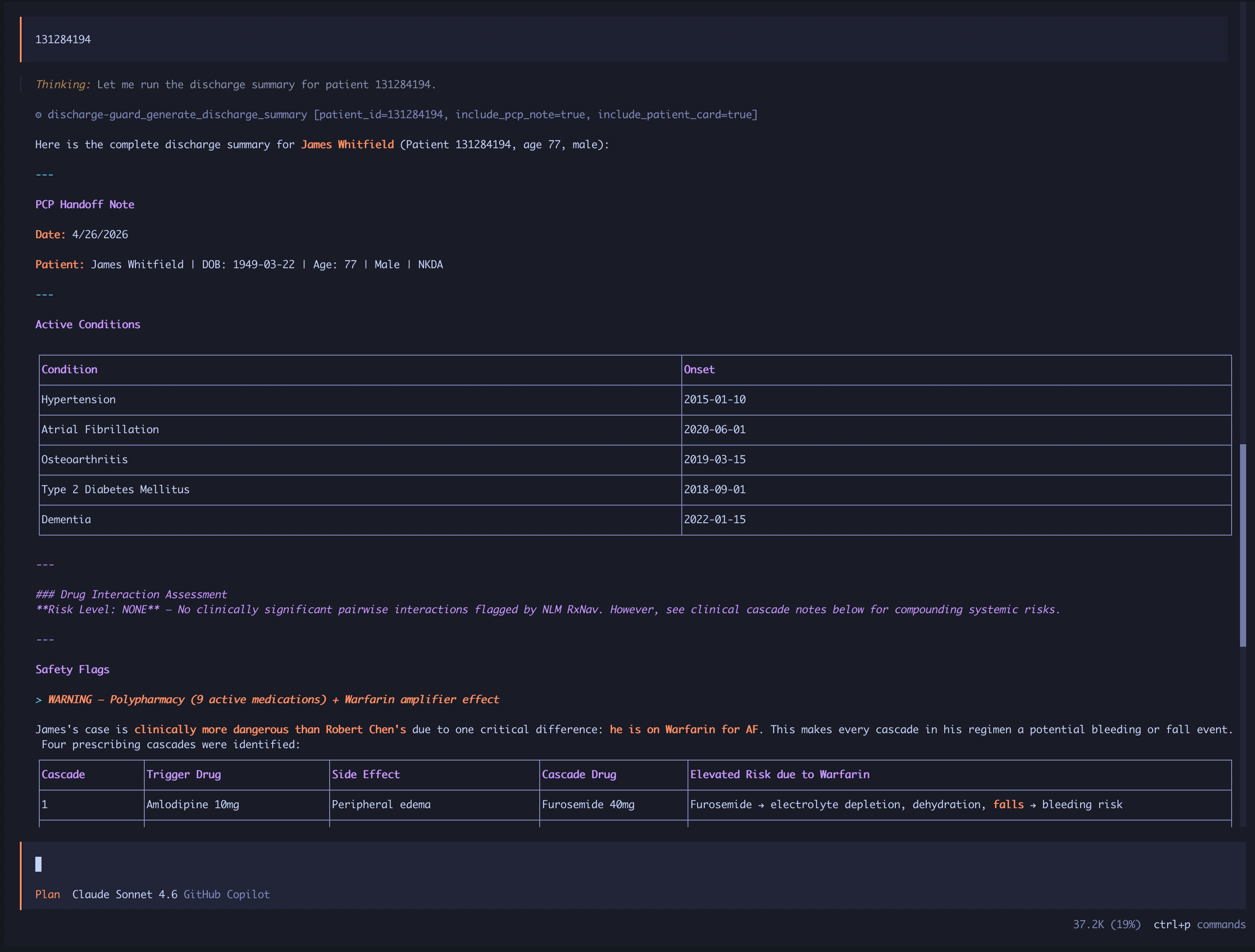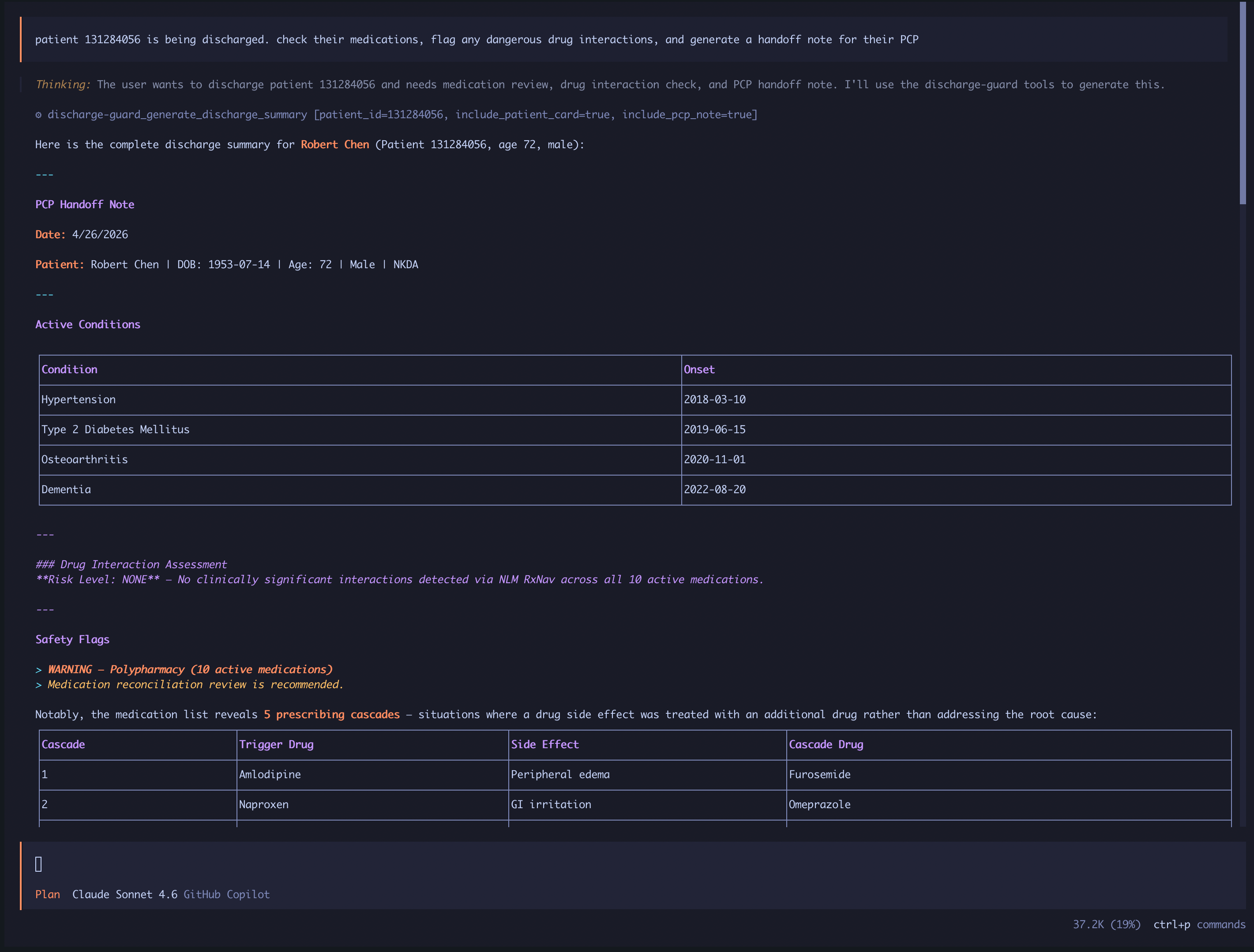 DischargeGuard is an MCP server that plugs into clinical workflows through Prompt Opinion. At discharge, it: