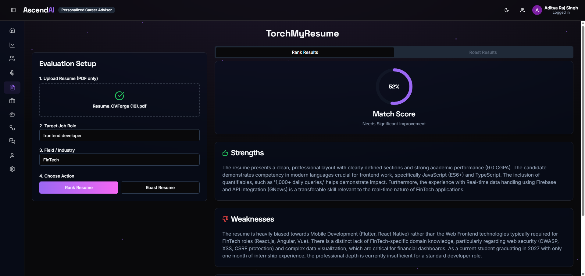 • PDF Parsing was a Headache: Resumes come in weird formats—two columns, icons, tables. The AI used to get confused between the company name and the job title. We had to switch to Gemini’s vision capabilities to fix this.