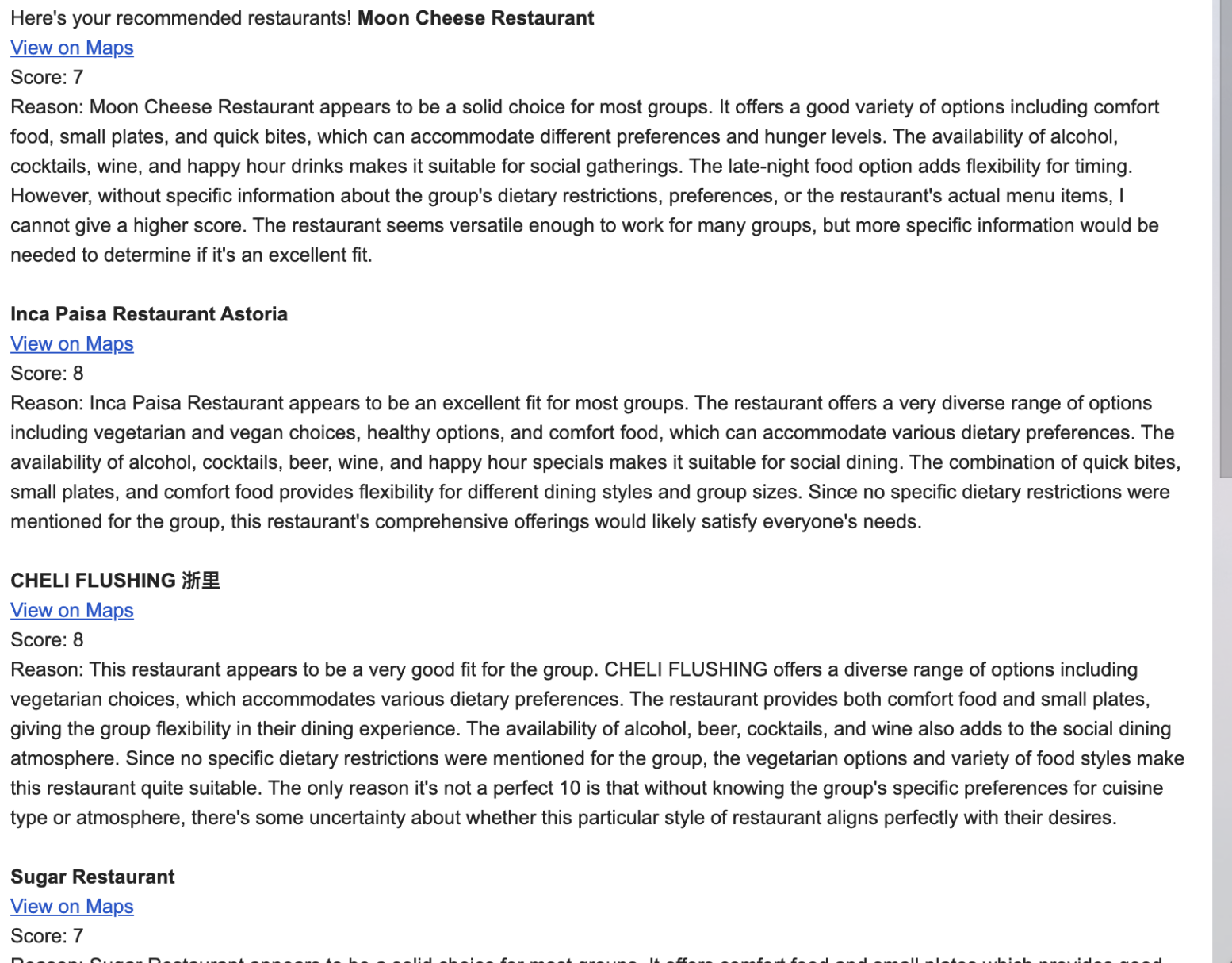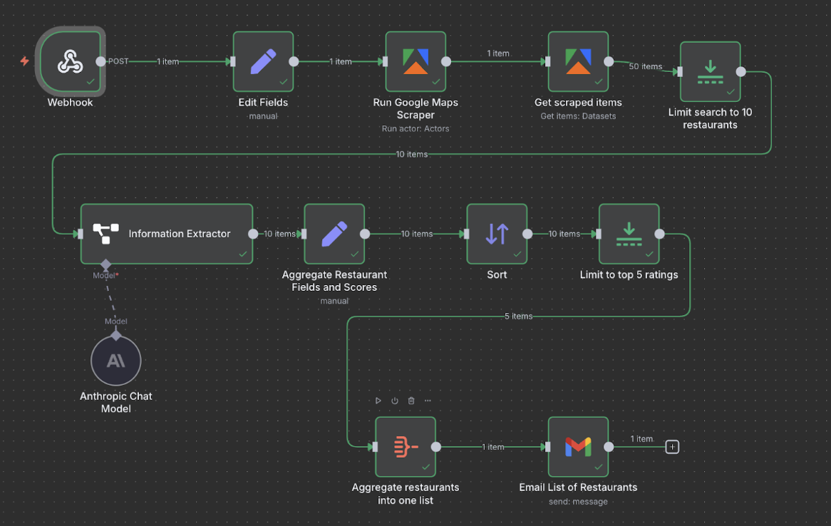 Using n8n came with a learning curve, as getting comfortable with its interface and configuring workflows took some time. Initially, we aimed to integrate multiple APIs to enrich our data sources, but given time constraints, we focused on Google Maps as our primary provider. Designing the frontend was also challenging within the limited timeframe, as balancing functionality with a clean user experience required prioritizing core features. Additionally, while we wanted to evaluate multiple restaurants simultaneously, parallelism isn’t natively supported in n8n, which slowed down the workflow execution more than we anticipated.